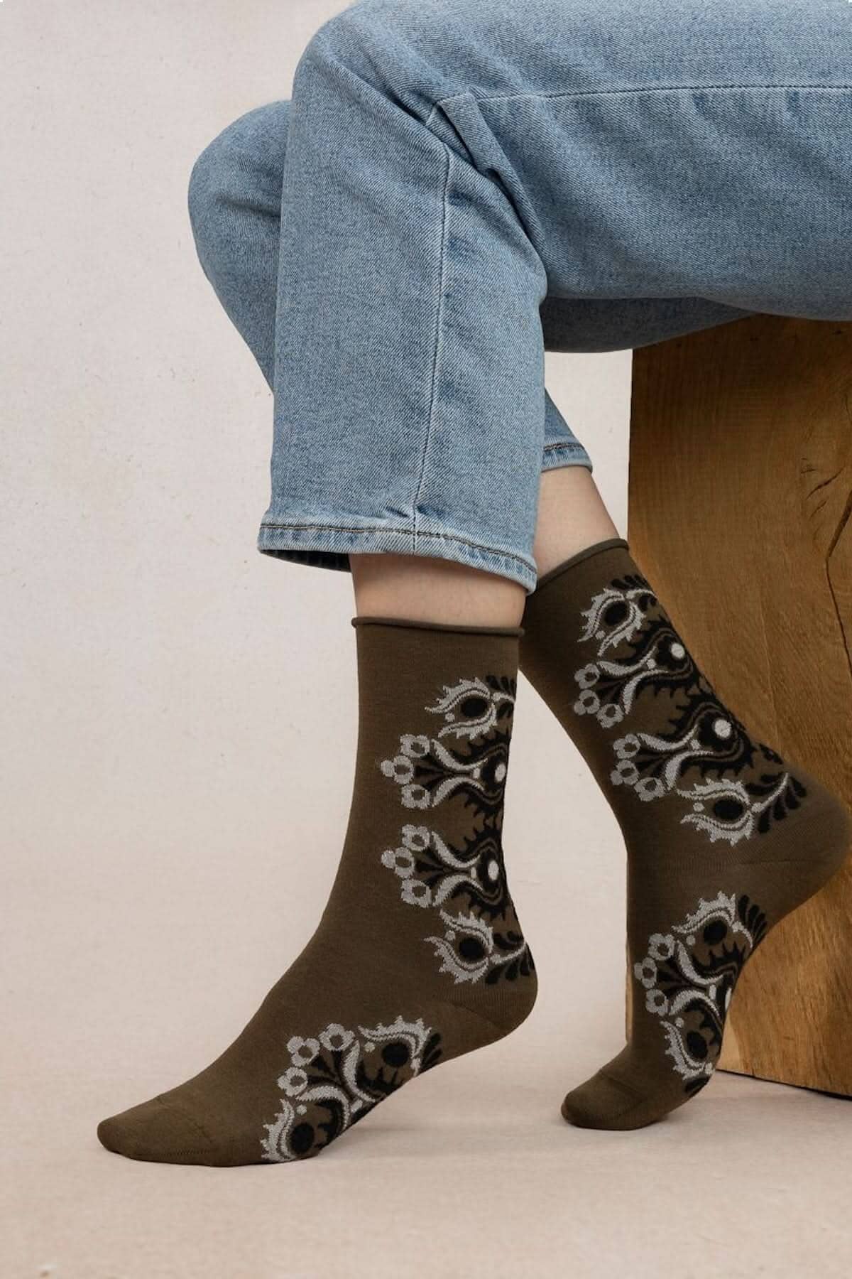 Description: Ces chaussettes pour femme vous offrent les qualités thermiques de la laine Mérinos et la douceur de leur intérieur 100% coton. Vous profitez d’une chaleur agréable, sans risque de démangeaison, et d’une finesse qui vous permet de porter ces chaussettes dans toutes vos chaussures d’hiver. Ce motif fleurs folke, très tendance, viendra apporter une touche rock à votre tenue.