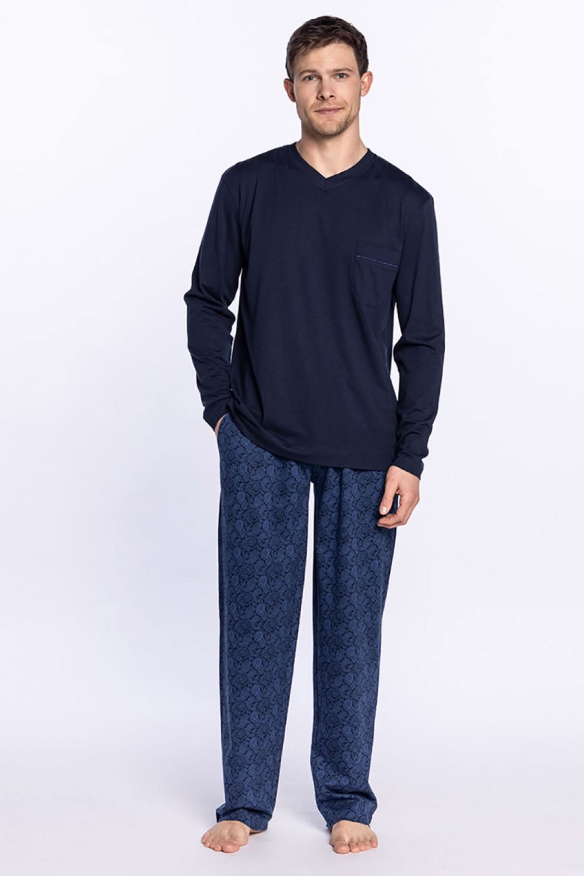 DESCRIPTION: Ce pyjama long en modal et coton allie confort et fonctionnalité. Le t-shirt, doté d'une poche poitrine, d'un col en V et de manches longues, se marie parfaitement avec le pantalon long imprimé, qui possède des poches latérales et une taille élastique réglable avec cordon de serrage. Son tissu hautement absorbant et respirant en fait un choix idéal pour des nuits agréables.