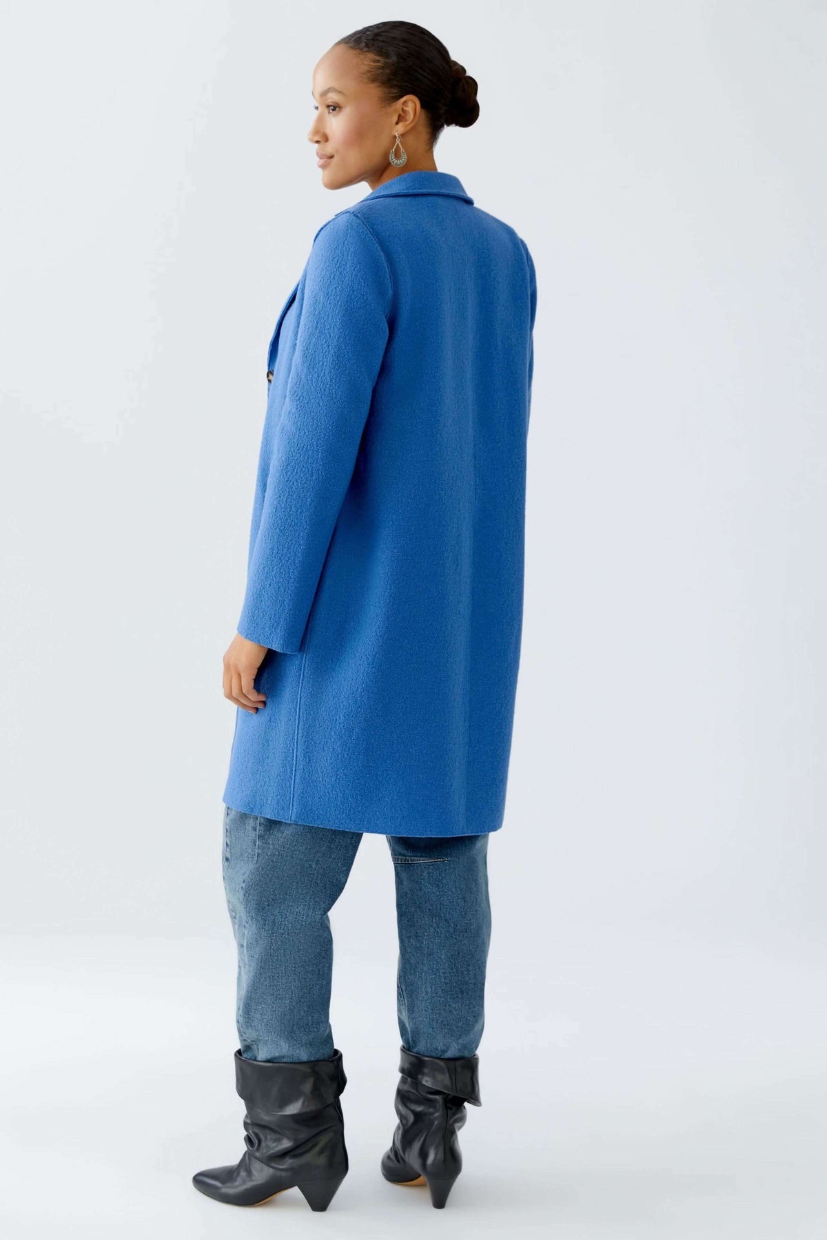 Manteau Mayson bleu sur modèle féminin, coupe droite et longue, porté avec jean et bottes pour un look chic.