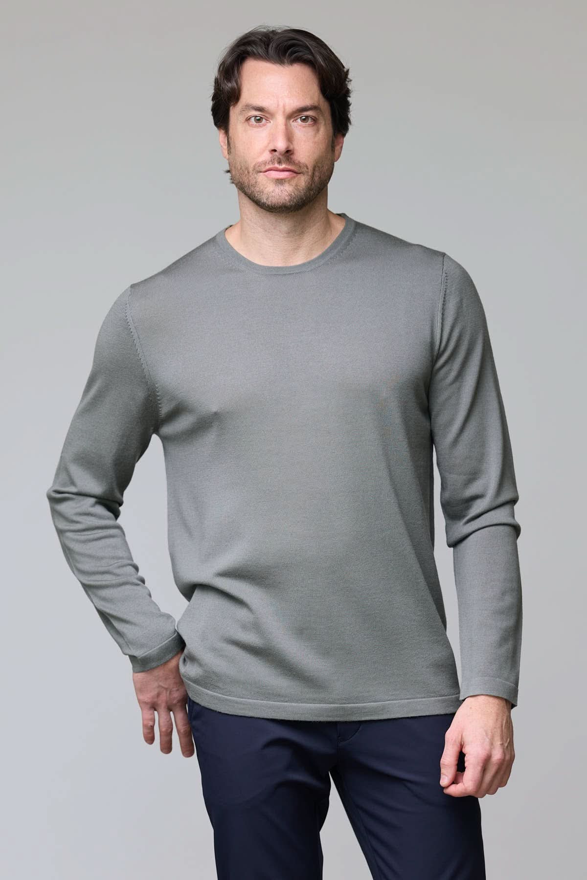 Description : Ce chandail à col rond séduit par sa texture douce et son tombé fluide. Léger et élégant, il peut se porter seul ou sous un veston pour un look raffiné. Sa maille fine assure un confort optimal tout en offrant une allure soignée en toute simplicité.