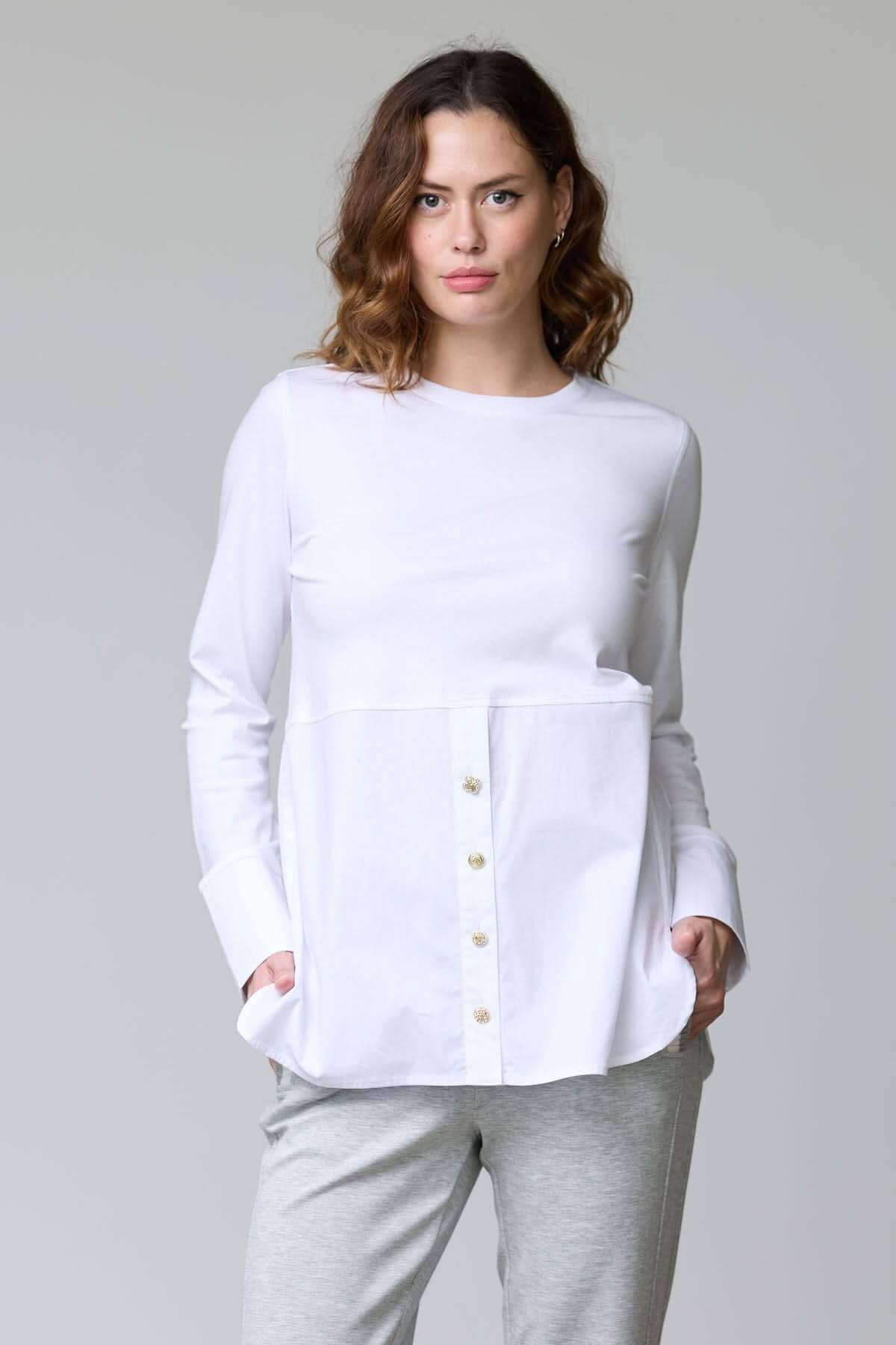 Description: This long-sleeved sweater stands out with its sleek design and decorative buttons on the front. Comfortable and elegant, it combines the style of a shirt with the softness of a lightweight knit, perfect for a chic, casual look.