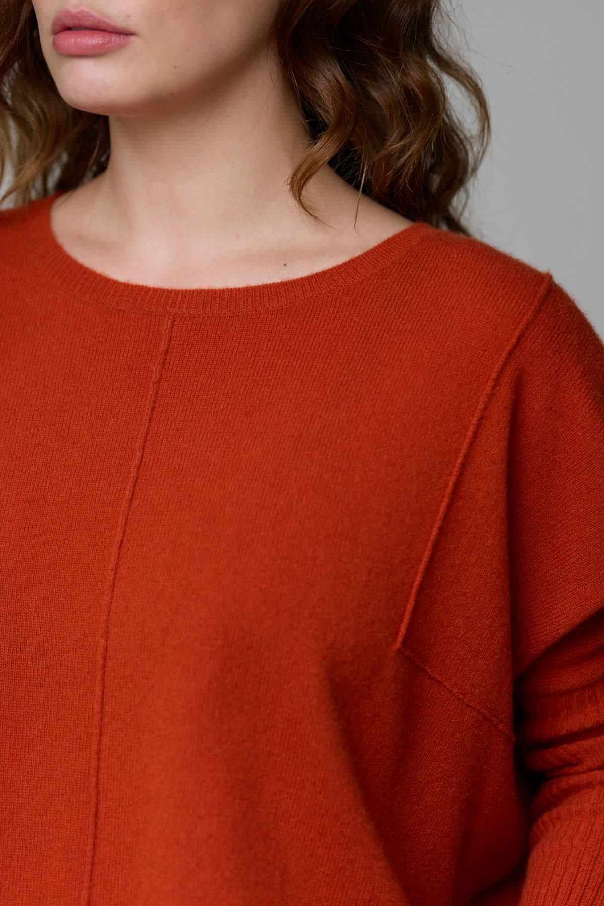 Description: Loose-fitting crew neck sweater made from soft, luxurious knit fabric. Its visible seams and slightly dropped sleeves give it a modern, relaxed look. A chic and comfortable piece, perfect for cool fall days.