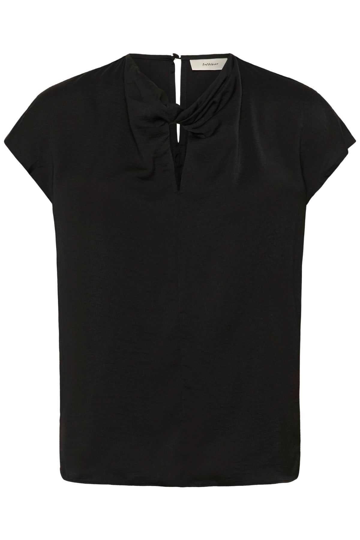 Description: Lightweight blouse with a flowing drape, featuring an original bow-effect collar and a small V-neckline. Its short sleeves and relaxed fit make it an elegant and comfortable piece for everyday wear. Style tip: wear it tucked into tailored pants or a pencil skirt for a chic and modern look.