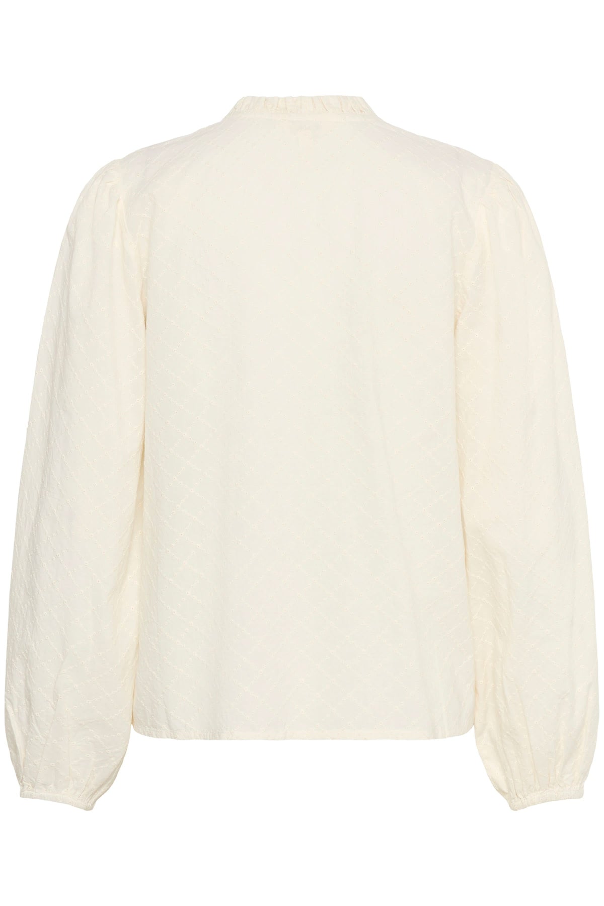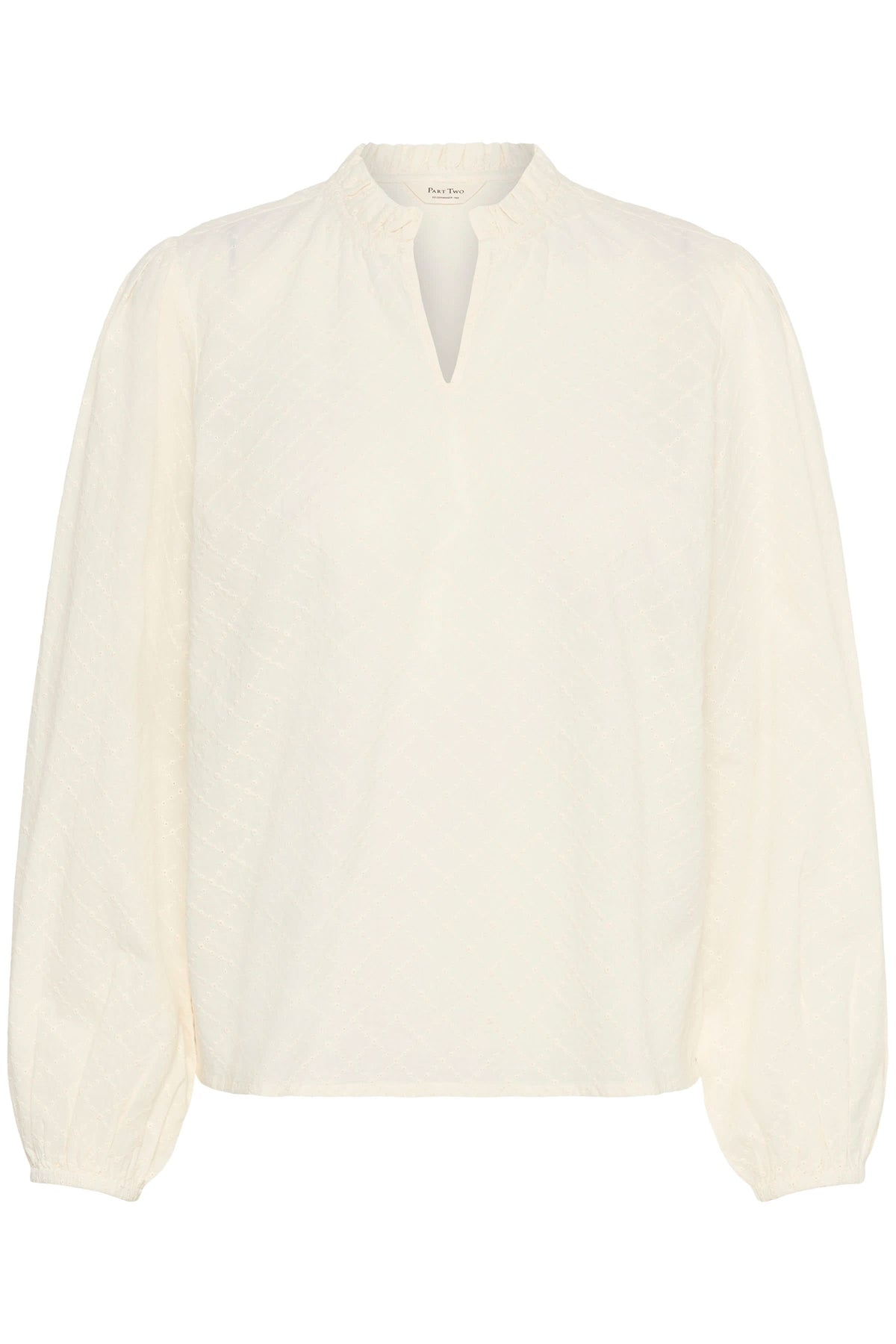 Description: This lightweight blouse charms with its delicate fabric, subtle pattern, and flowing cut. Its subtle slit neckline and long puff sleeves give it a feminine and refined look. Style tip: wear it tucked into dress pants or a skirt for a chic and elegant look.