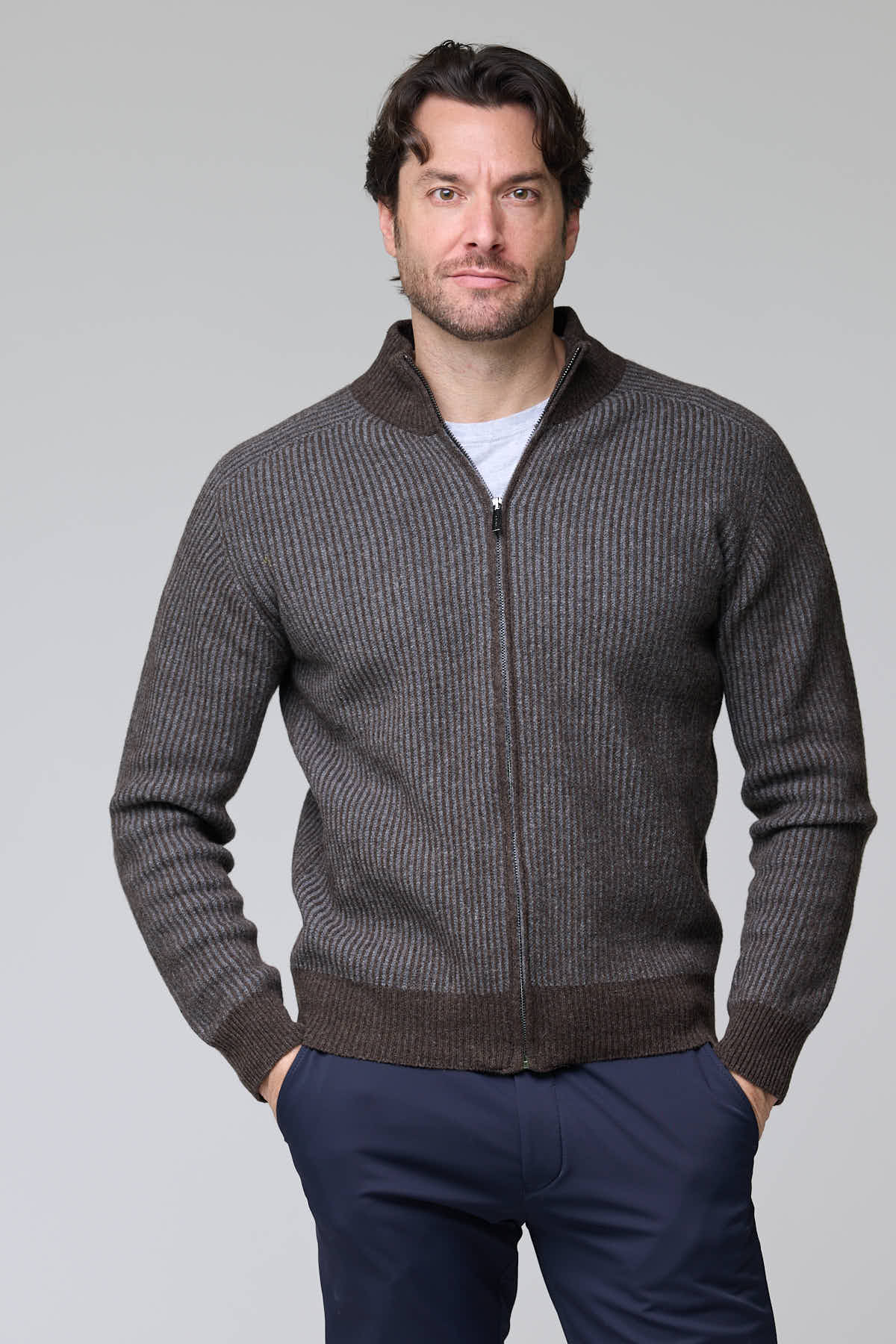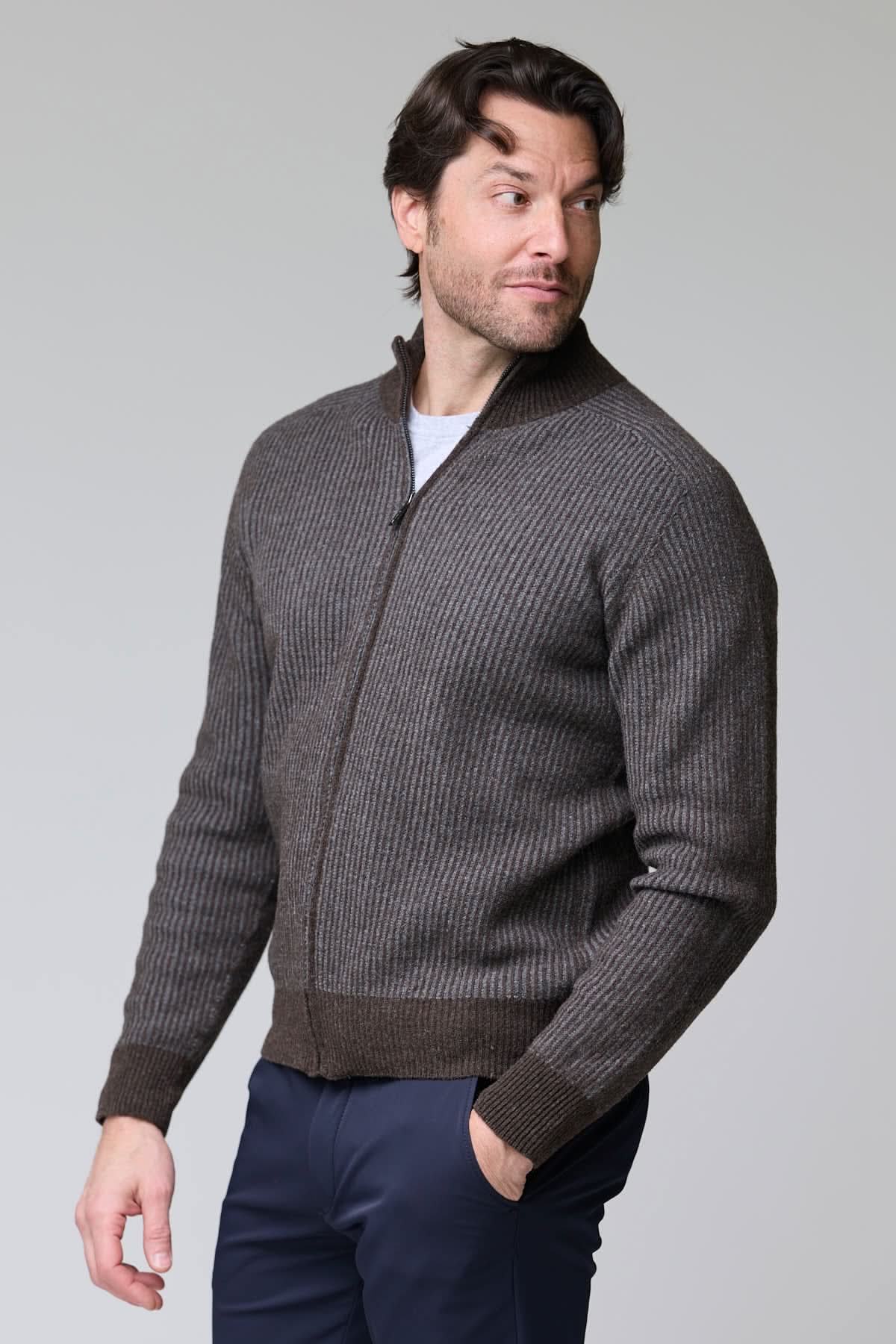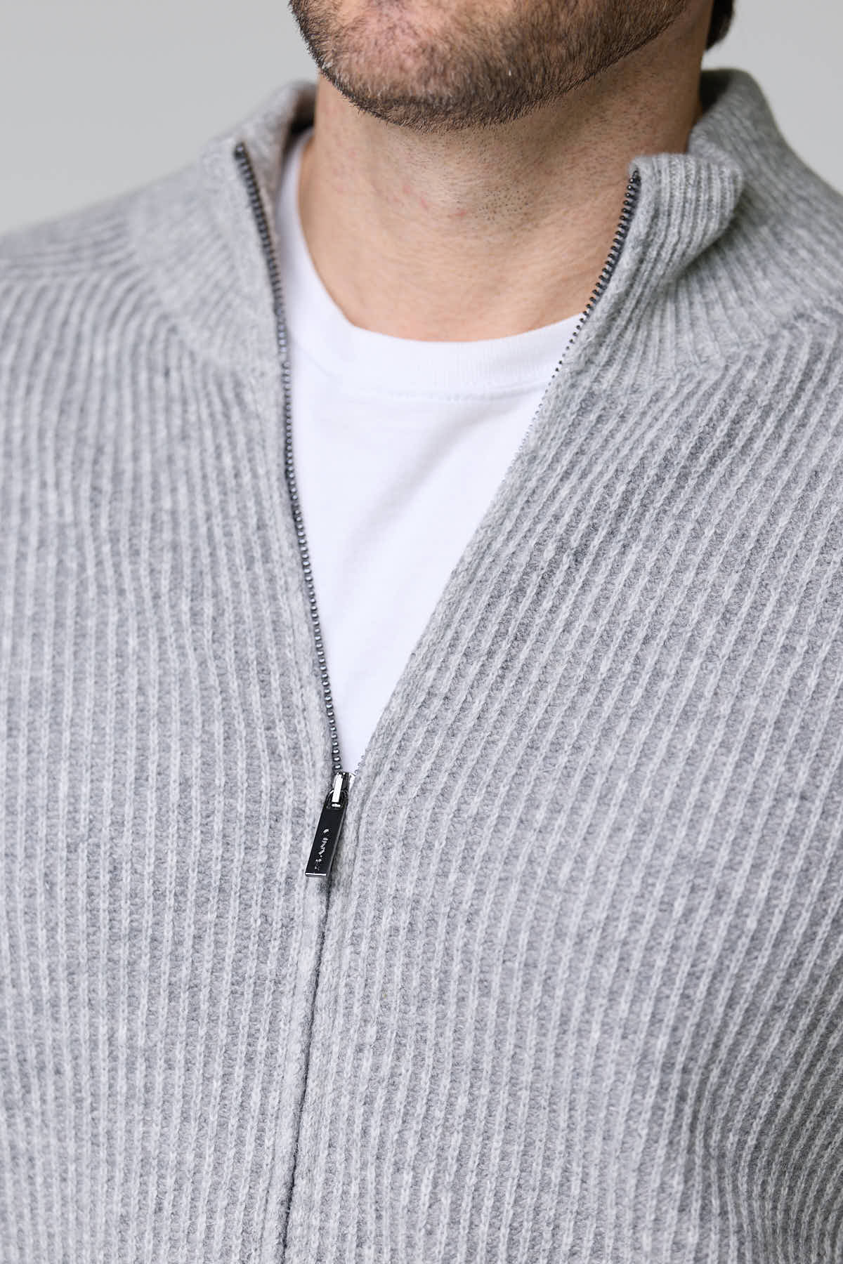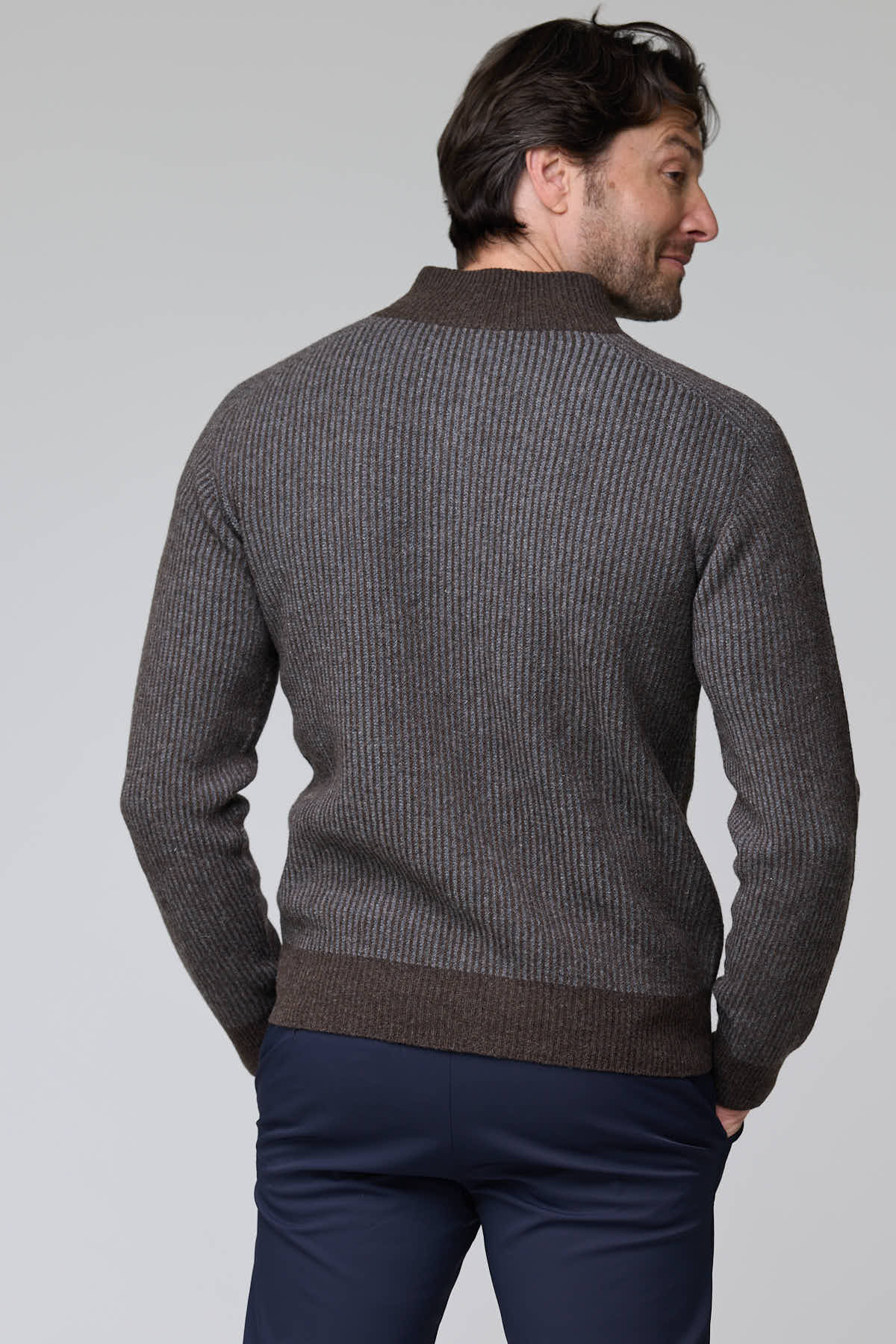 Homme portant un chandail à demi-glissière torsadé en laine mérinos gris, montrant le motif côtelé et la fermeture éclair élégante.