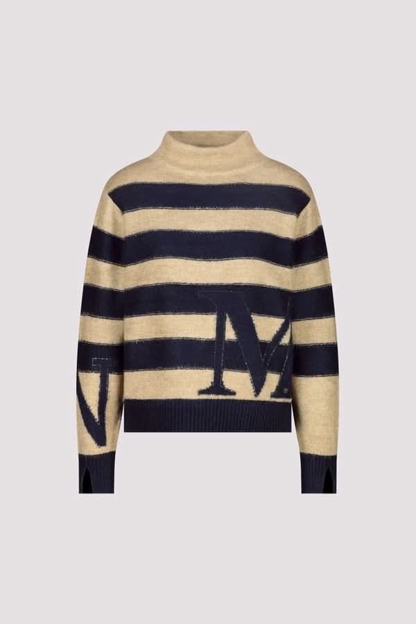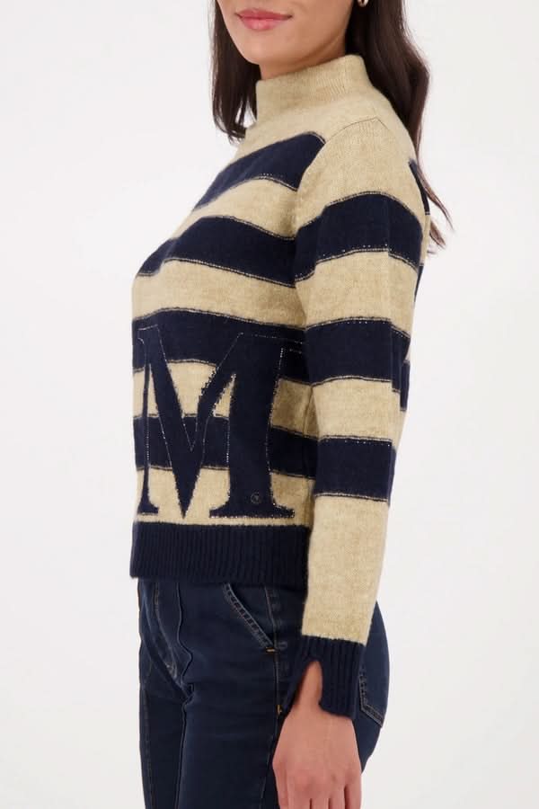 Description: Soft knit sweater featuring wide contrasting stripes and a discreet stand-up collar. Its straight, modern cut is enhanced by jacquard lettering for a graphic touch. Style tip: wear it with slim-fit jeans or tailored pants for a chic and comfortable look.