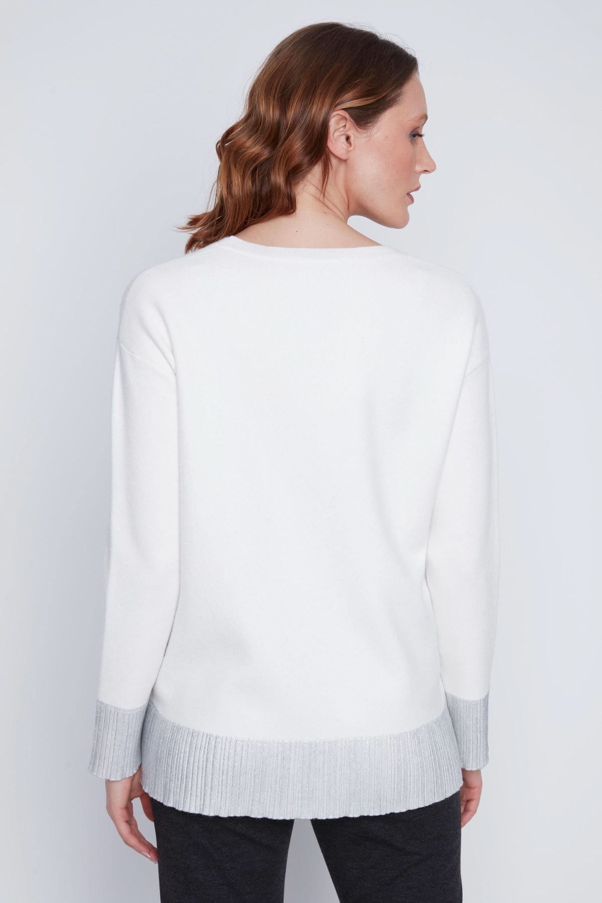 Description: This long-sleeved sweater features a sleek design enhanced with metallic details on the chest pocket and cuffs. Its straight fit and soft texture ensure comfort and elegance, perfect for a chic, casual look. Style tip: wear it with black or gray pants to bring out its metallic accents.