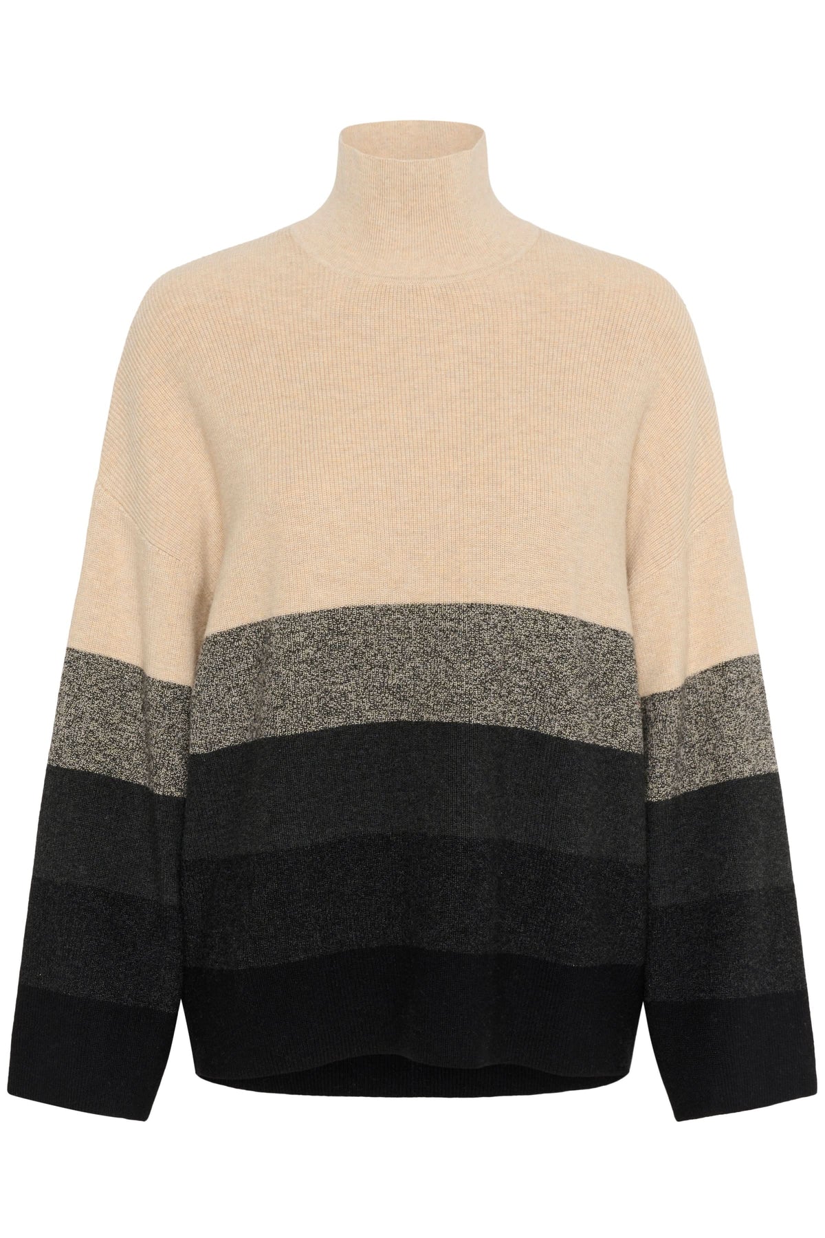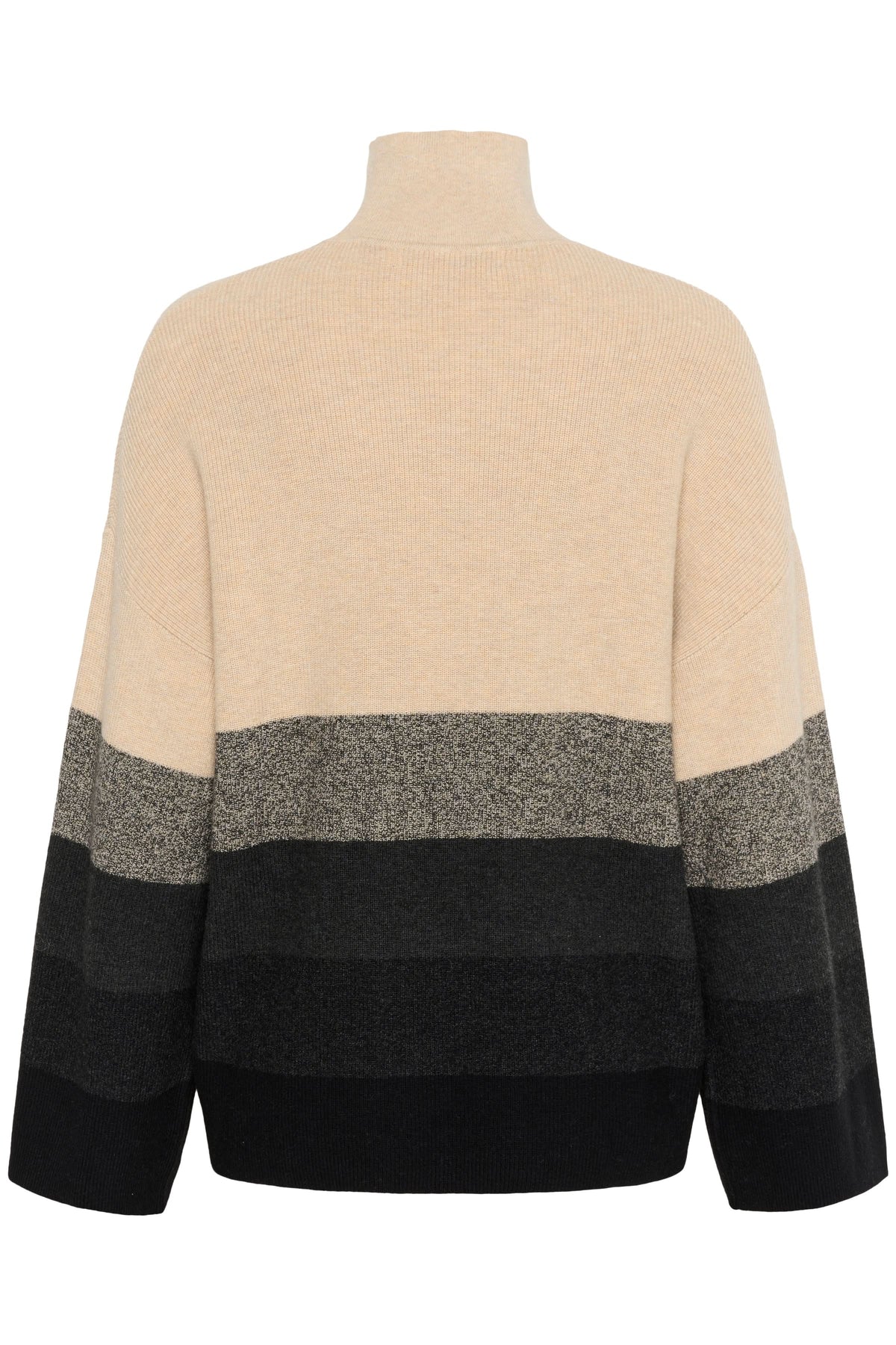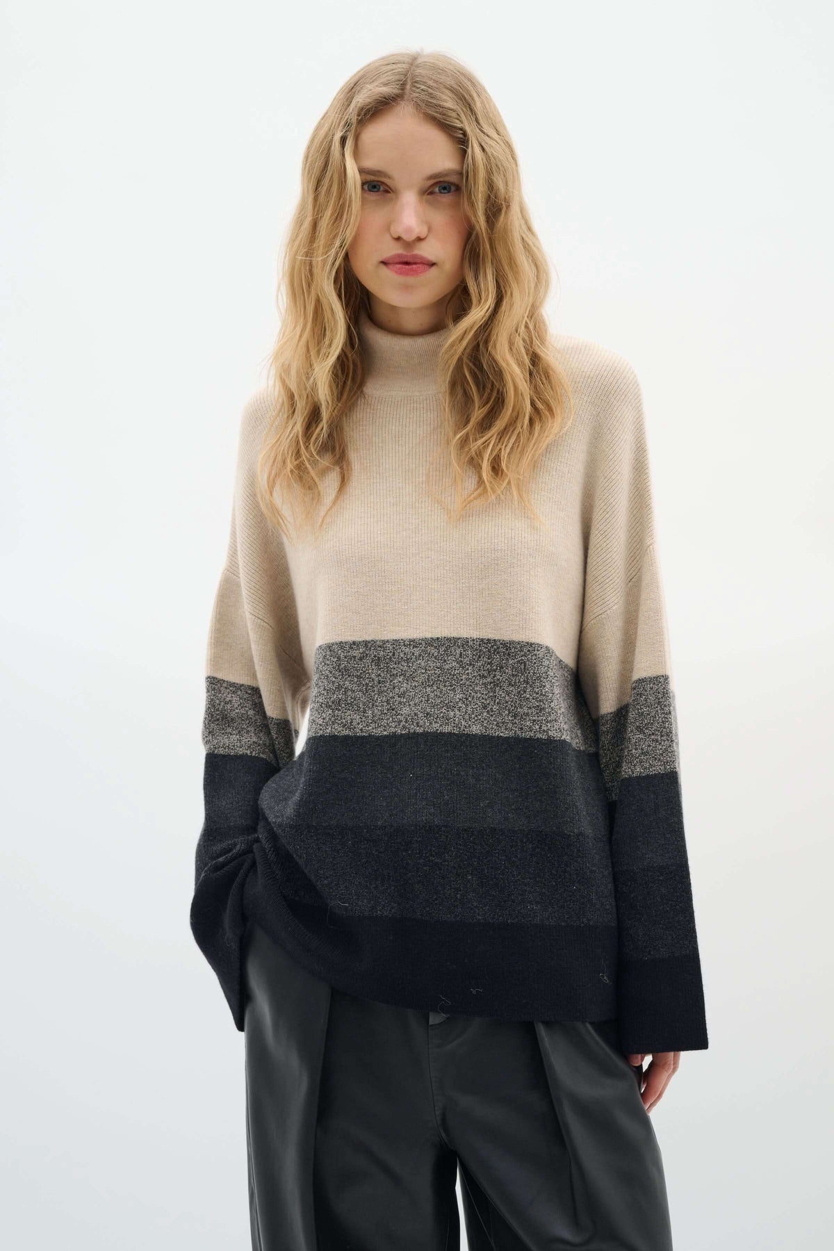 Chandail Gittel à col montant avec larges rayures horizontales en beige, gris et noir, coupe ample et décontractée.