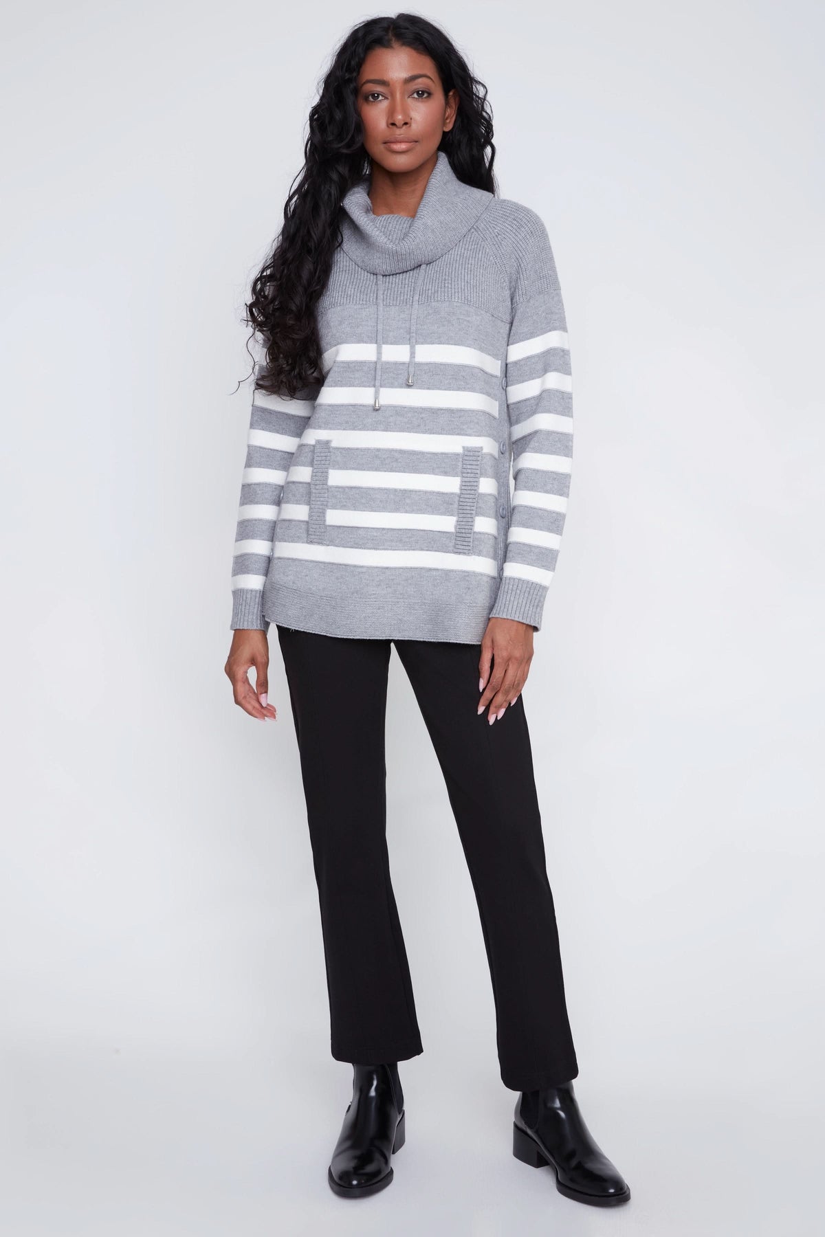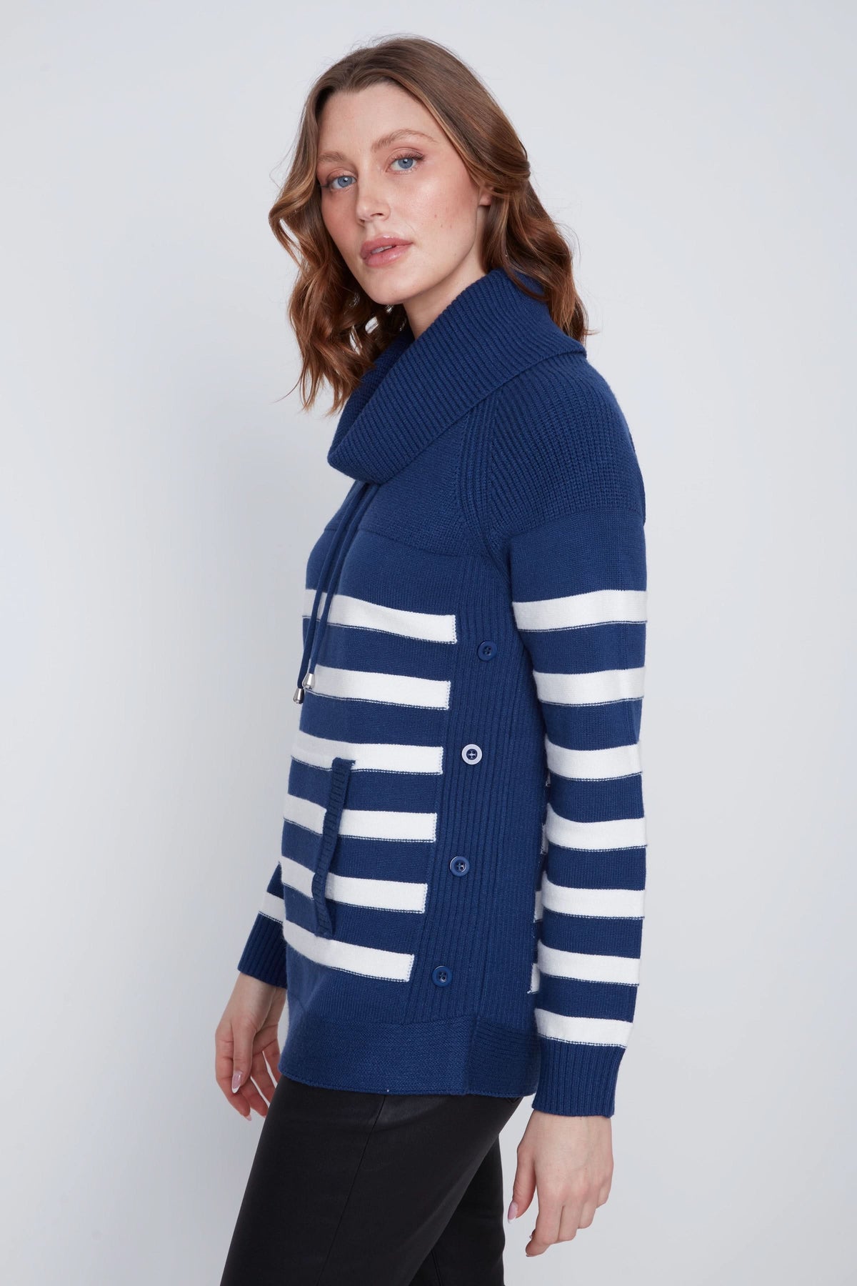 Description: This long-sleeved sweater features a contrasting horizontal stripe pattern for a timeless navy look. Its drawstring-adjustable cowl neck adds a cozy and elegant touch, while the front pocket adds a practical touch. Style tip: wear it with white pants or jeans for a casual chic look.