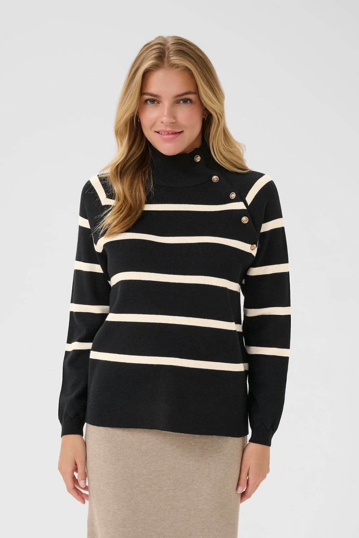 Description: This striped turtleneck sweater charms with its updated navy style and refined details. Decorative buttons at the shoulder add a touch of elegance to its classic silhouette. Style tip: Wear it with a pencil skirt or straight pants for a chic, timeless look.