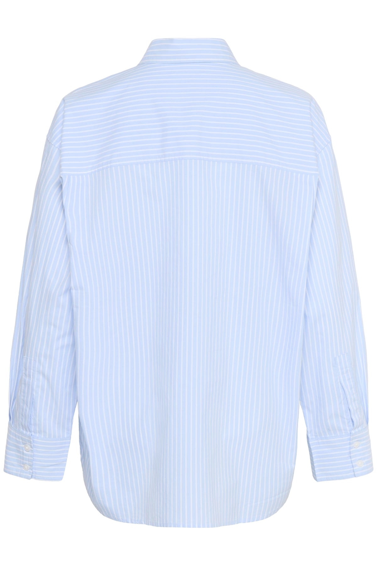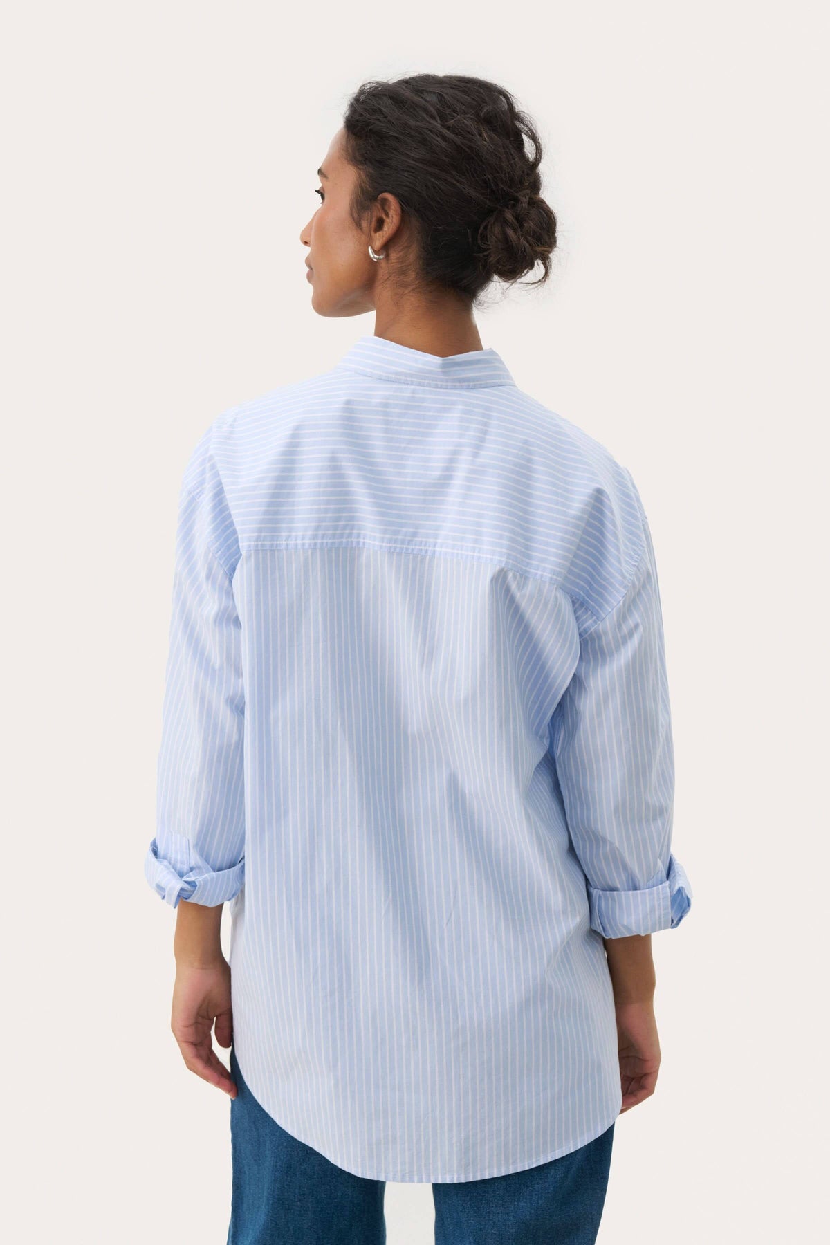 Chemise rayée Savanna bleue à rayures verticales, coupe ample, manches longues roulottées, col classique, tissu léger.
