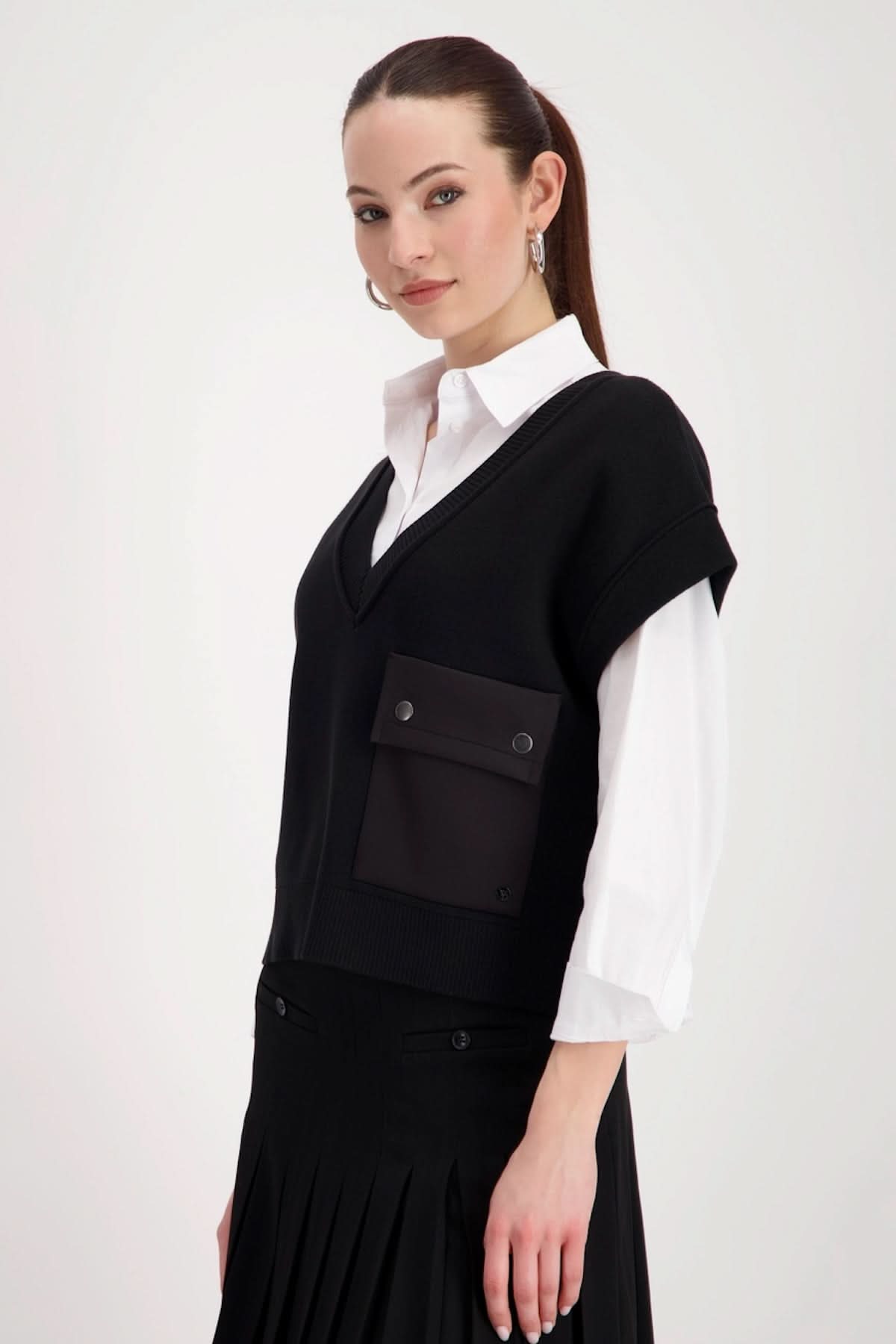 Description: This sleeveless V-neck top revisits classic style with a modern twist. Its sleek design is enlivened by a large patch pocket with flap on the front, adding a trendy and functional contrast. Style tip: layer it over a white shirt for a chic and structured look.
