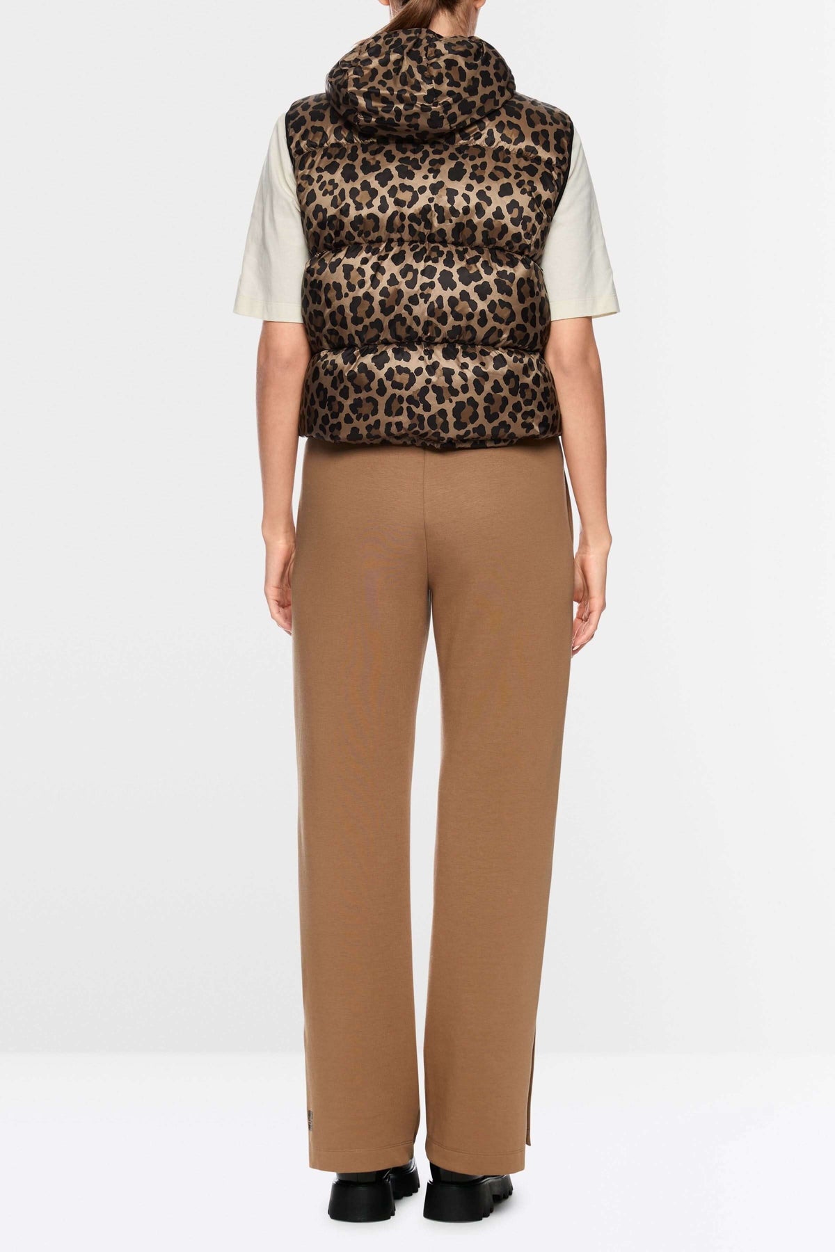 Pantalon décontracté à bandes contrastantes avec détails modernes et coupe droite, vu sous une veste matelassée à motif léopard.
