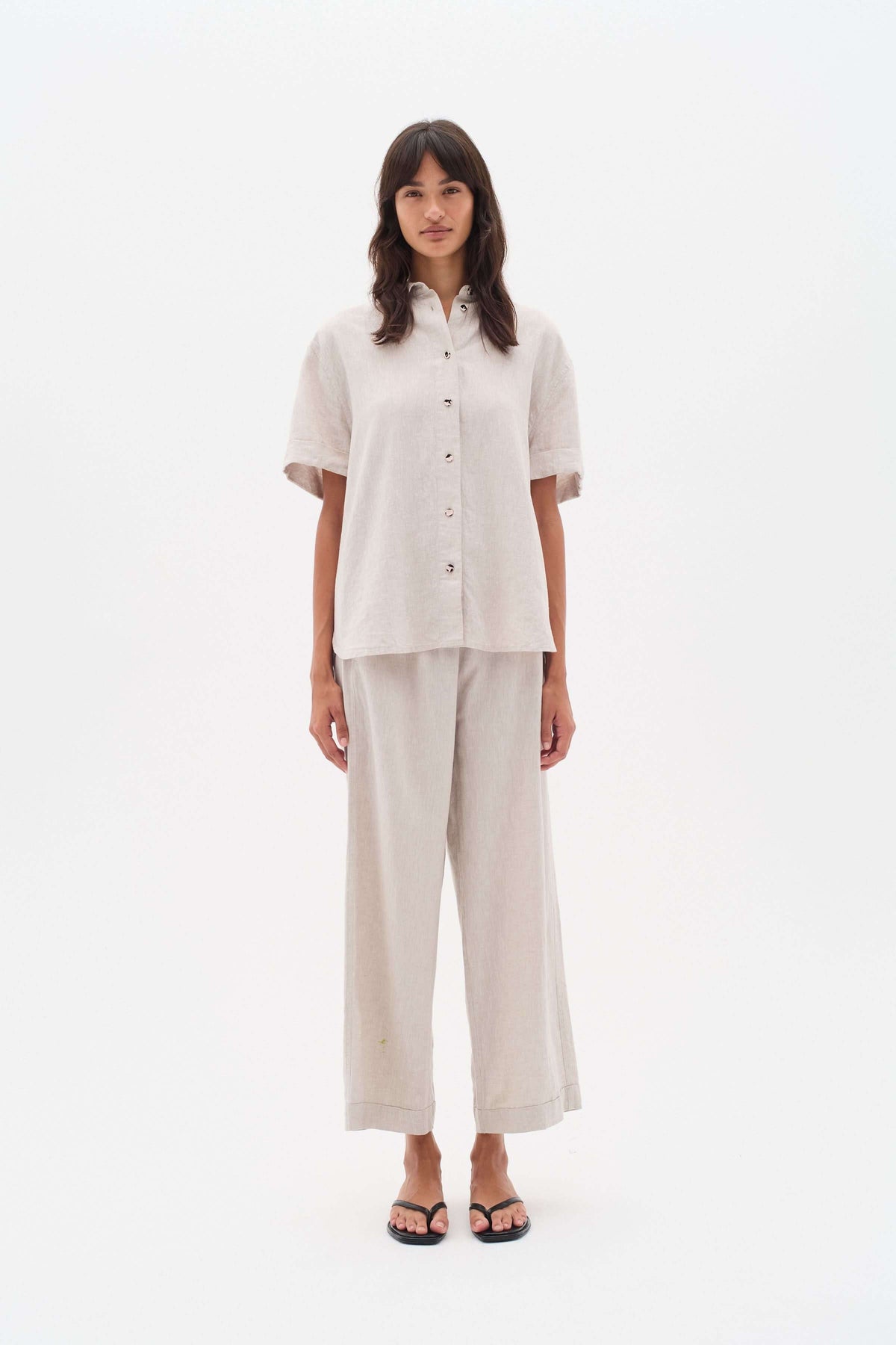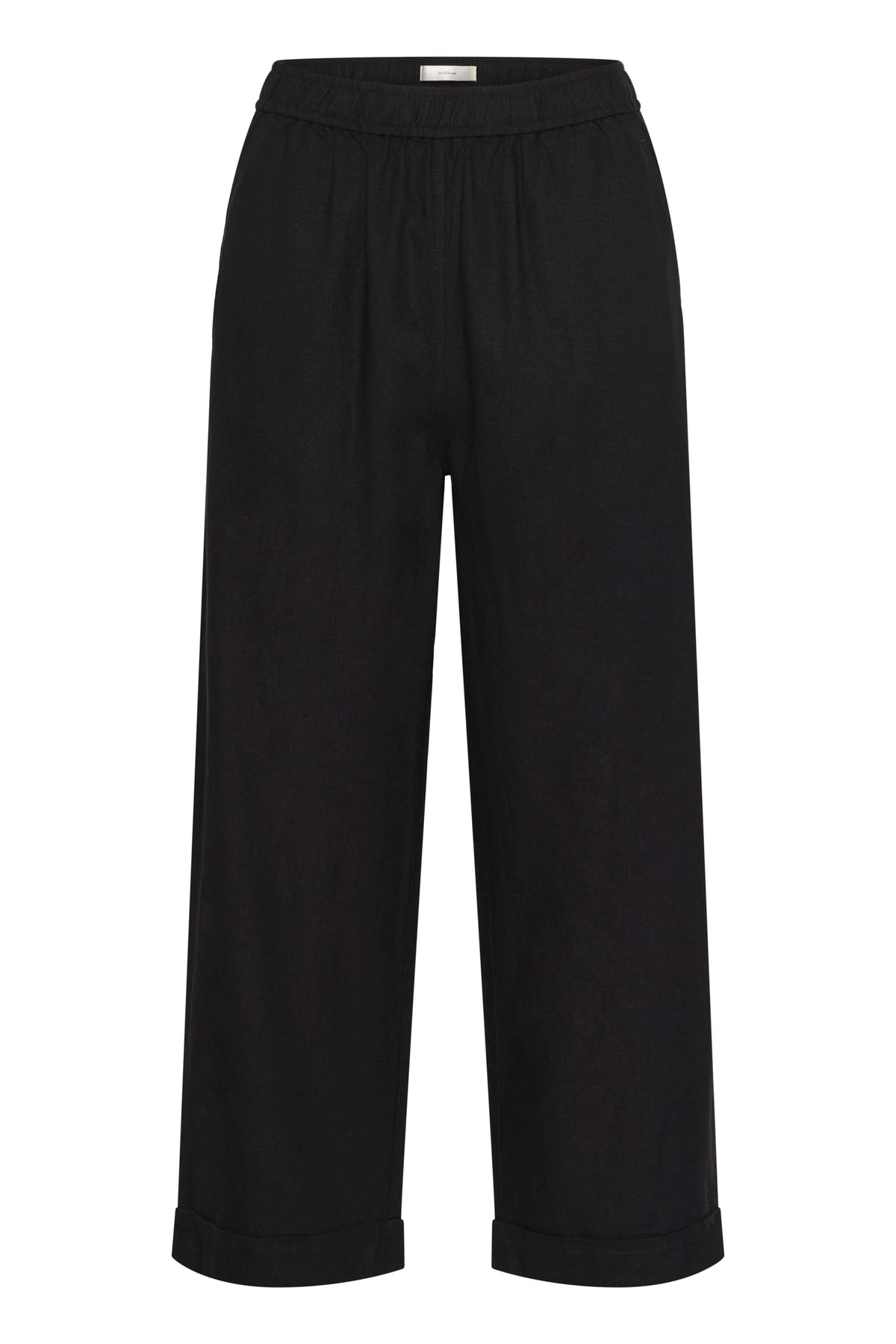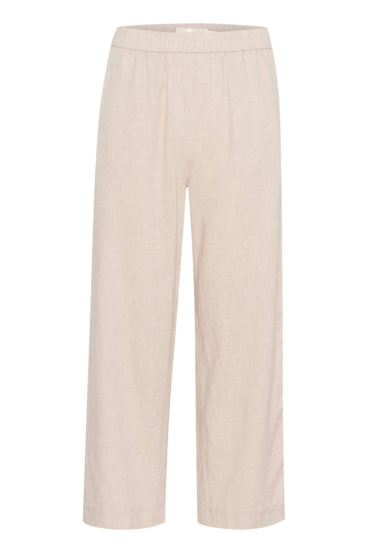 Description: Pantalon en mélange de lin léger avec taille élastique et jambes larges, parfait pour allier confort et élégance. Les plis marqués à l’avant et les poches latérales lui confèrent une allure soignée, tandis que le tissu texturé offre un tombé fluide et naturel.