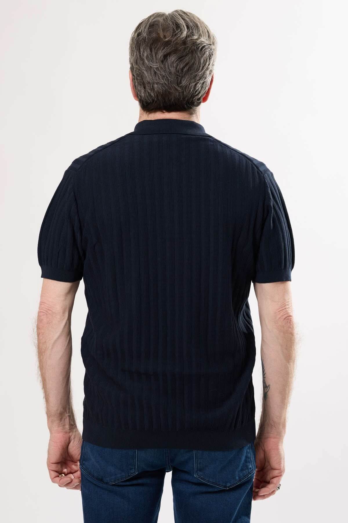 Description: This structured knit polo shirt features a stylish vertical ribbed pattern and retro-chic silhouette. Comfortable and distinctive, it's perfect for a refined look on summer days or evenings.