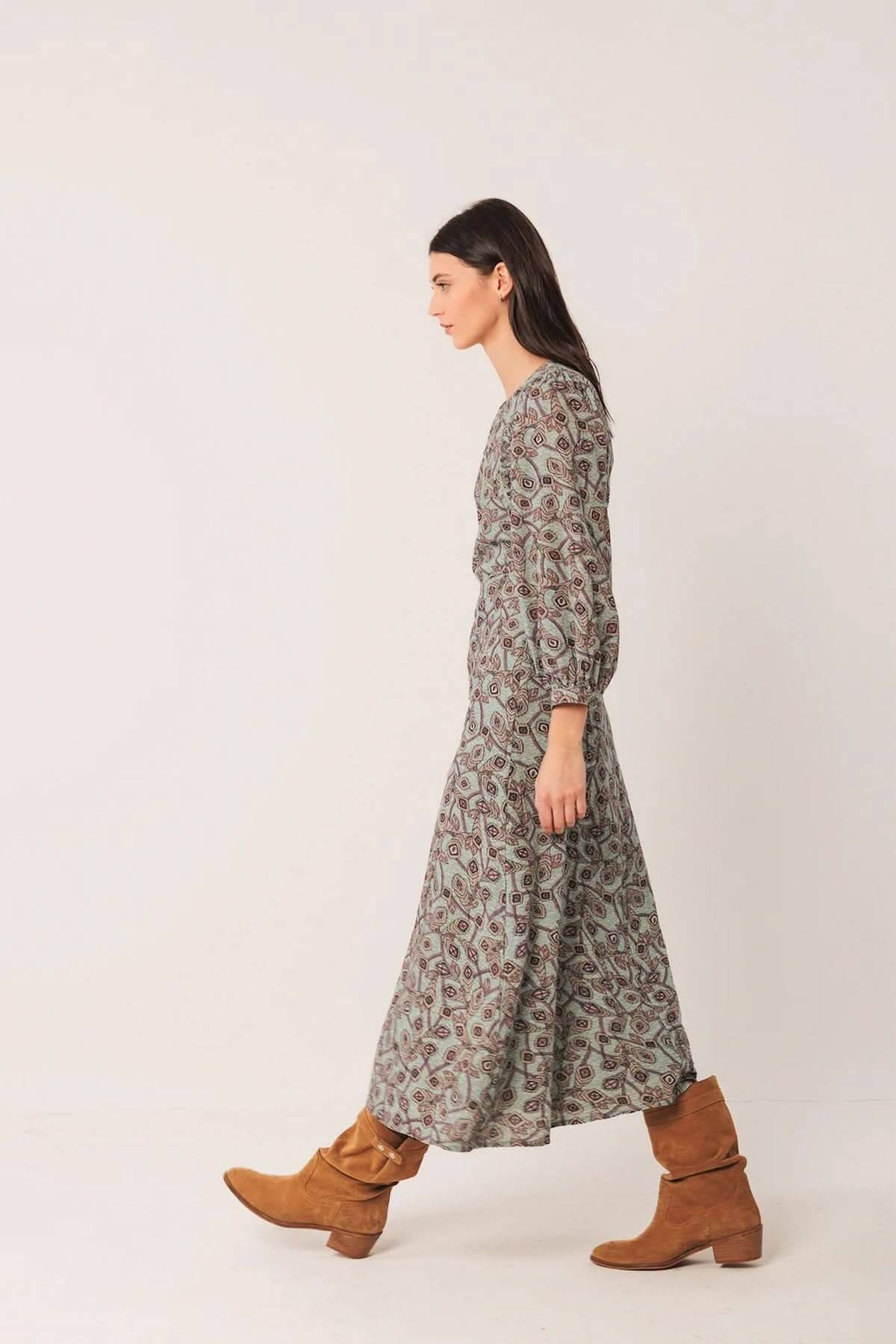 Description: This long dress with a geometric pattern features a flowing, elegant cut. Its slightly puffed long sleeves and round neckline give it a refined and comfortable style. Style tip: pair it with suede boots for a boho-chic look.