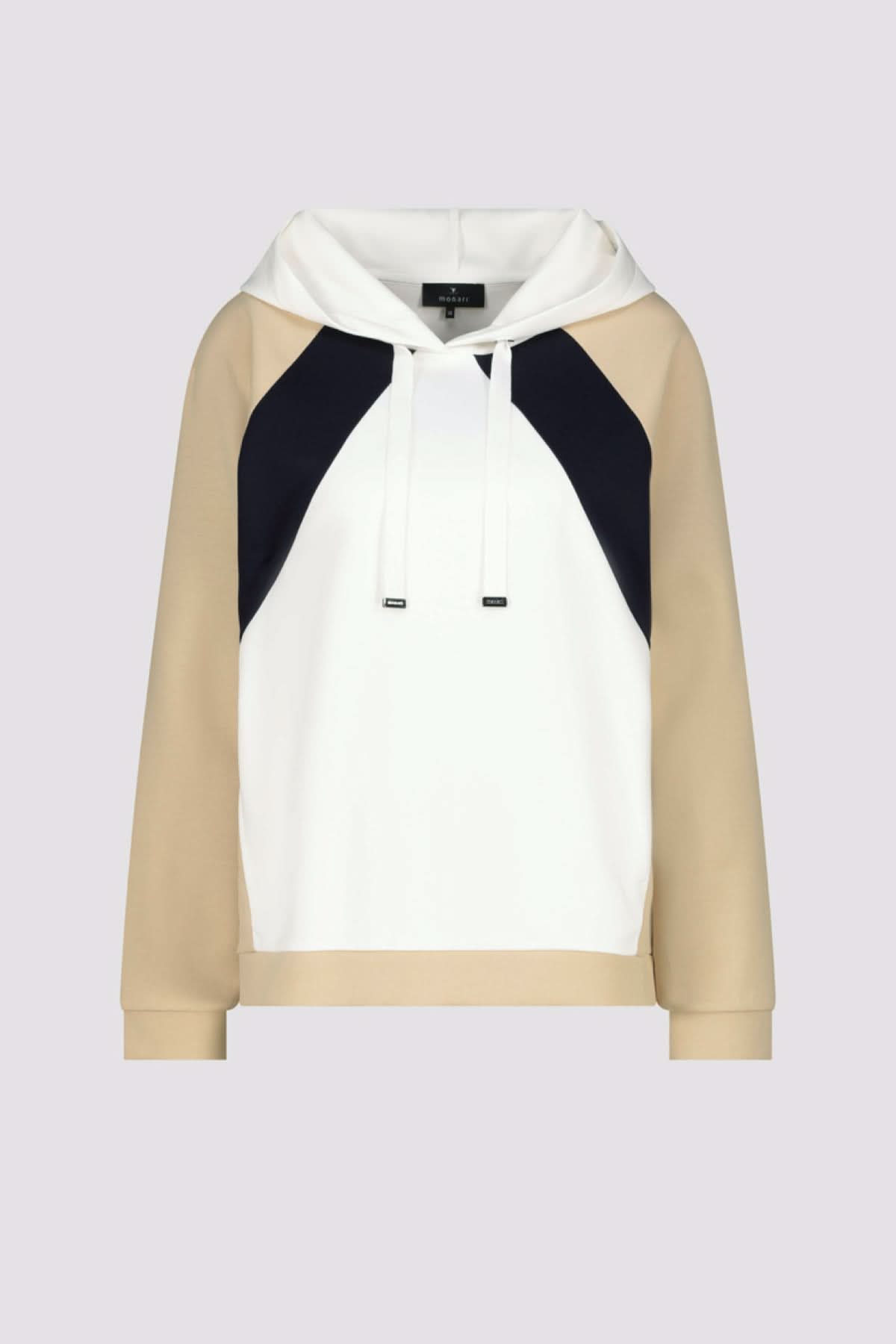 Description: Modern and comfortable hoodie, crafted in a color block style. It features three contrasting colors: white on the front and hood, beige on the sleeves and bottom, and black on the side panels. With a white drawstring with metal tips, this hoodie combines casual style with urban chic.