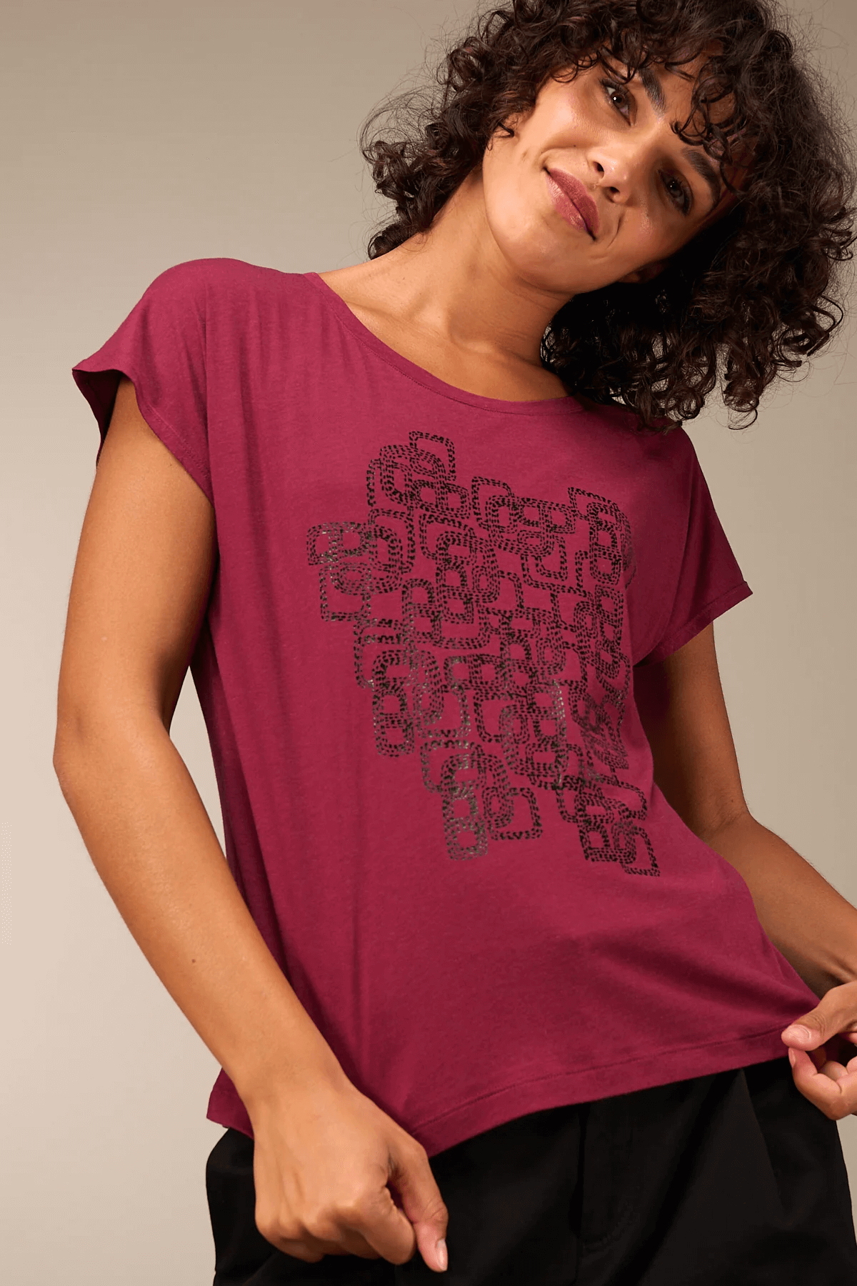 Description: This T-shirt features a relaxed fit with short drop sleeves and a soft round neckline. Its graphic print on the front adds a modern and original touch. Style tip: wear it with pants or jeans for a casual chic look.