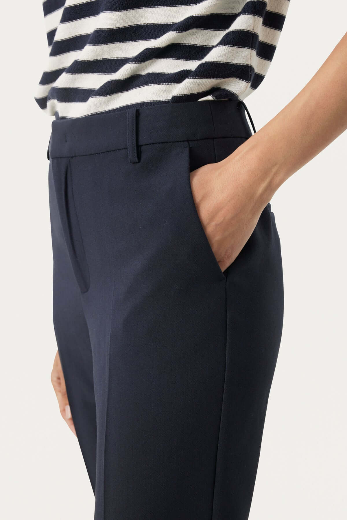 DESCRIPTION : These dress pants feature a sleek, tapered fit that elongates the silhouette, with a lightweight, fluid fabric for optimal comfort. Its slanted pockets add a practical touch, while the small slit at the ankle provides a refined finish. Wear it with a fitted blouse and pumps for a sophisticated look or with a tucked-in tee and loafers for a smart-casual outfit.