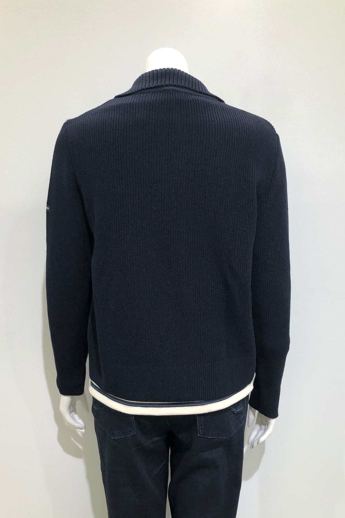 Cardigan zippé CHATEL marine avec col chemise classique, texture côtelée, manches longues, et poche décorative.