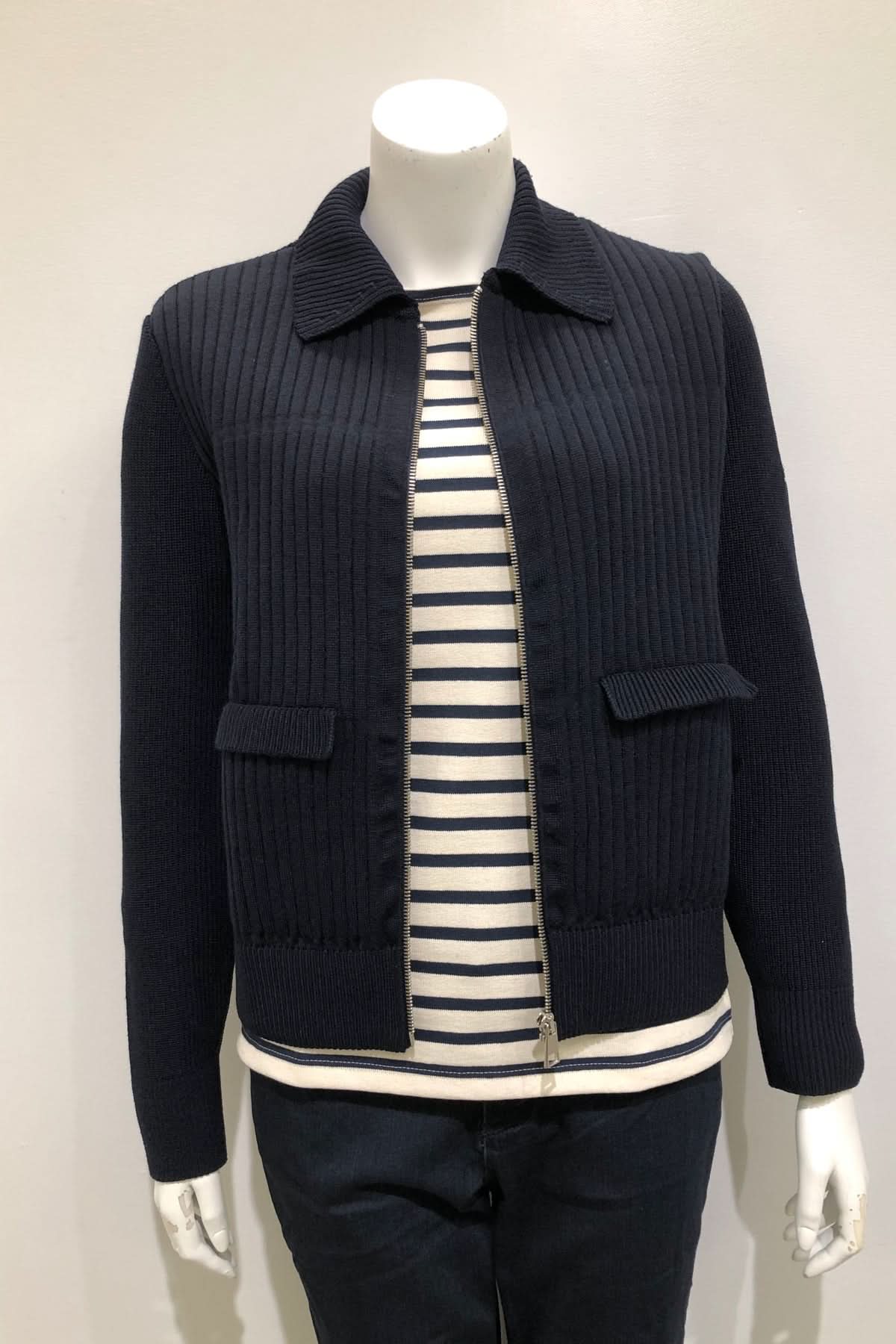 Mannequin wearing Cardigan zippé CHATEL marine, with ribbed texture, classic collar, over a striped navy and cream t-shirt.