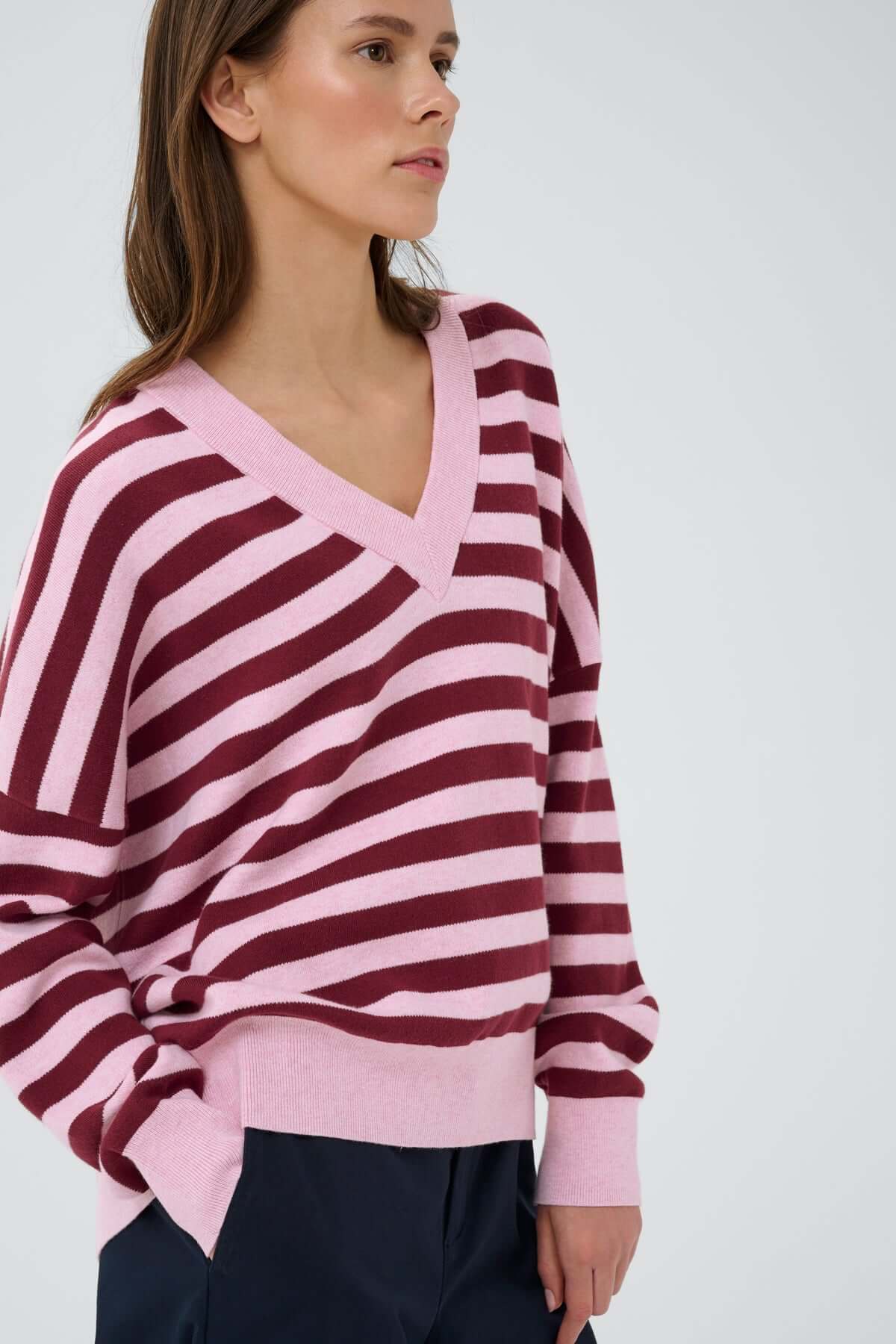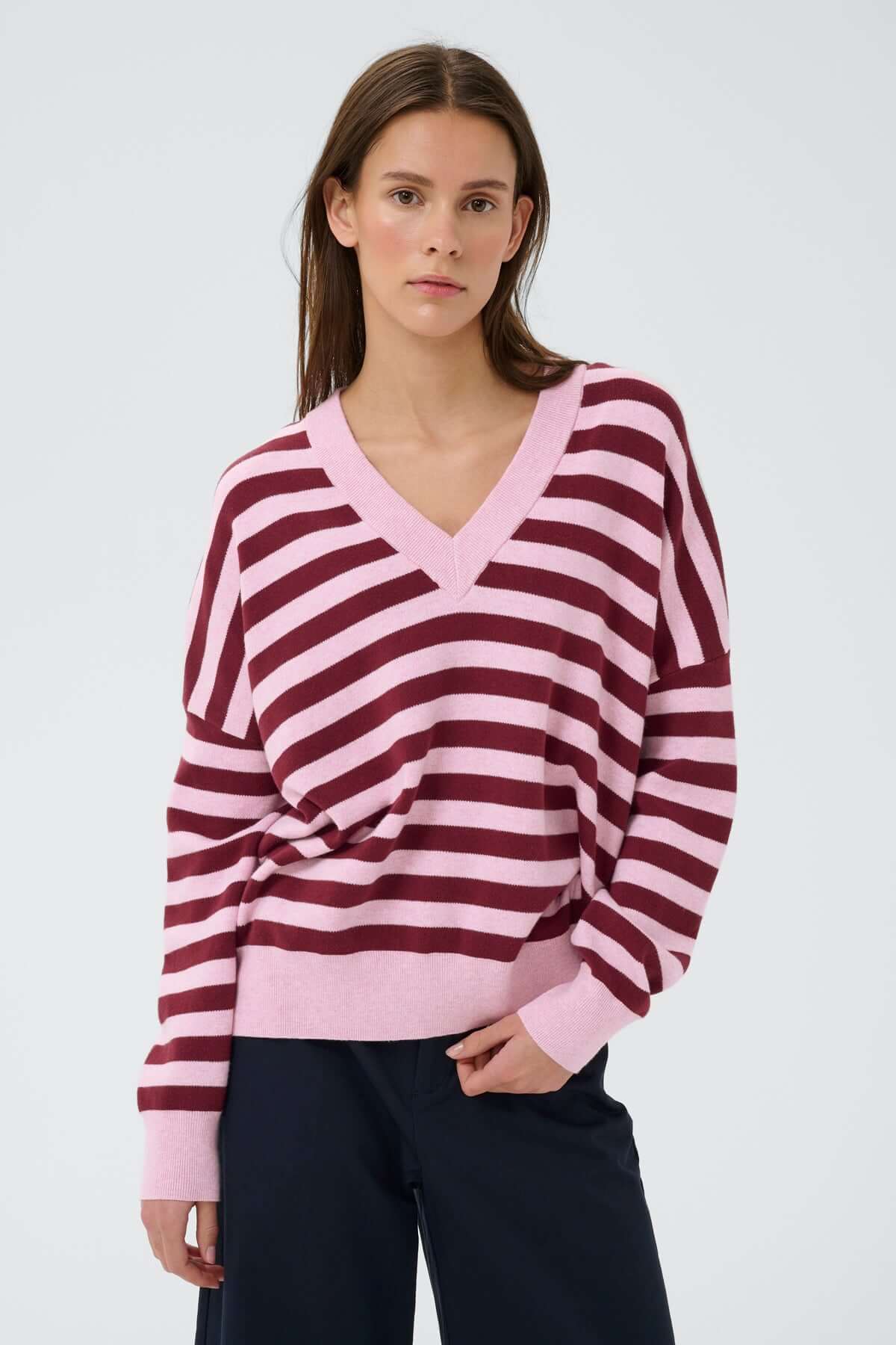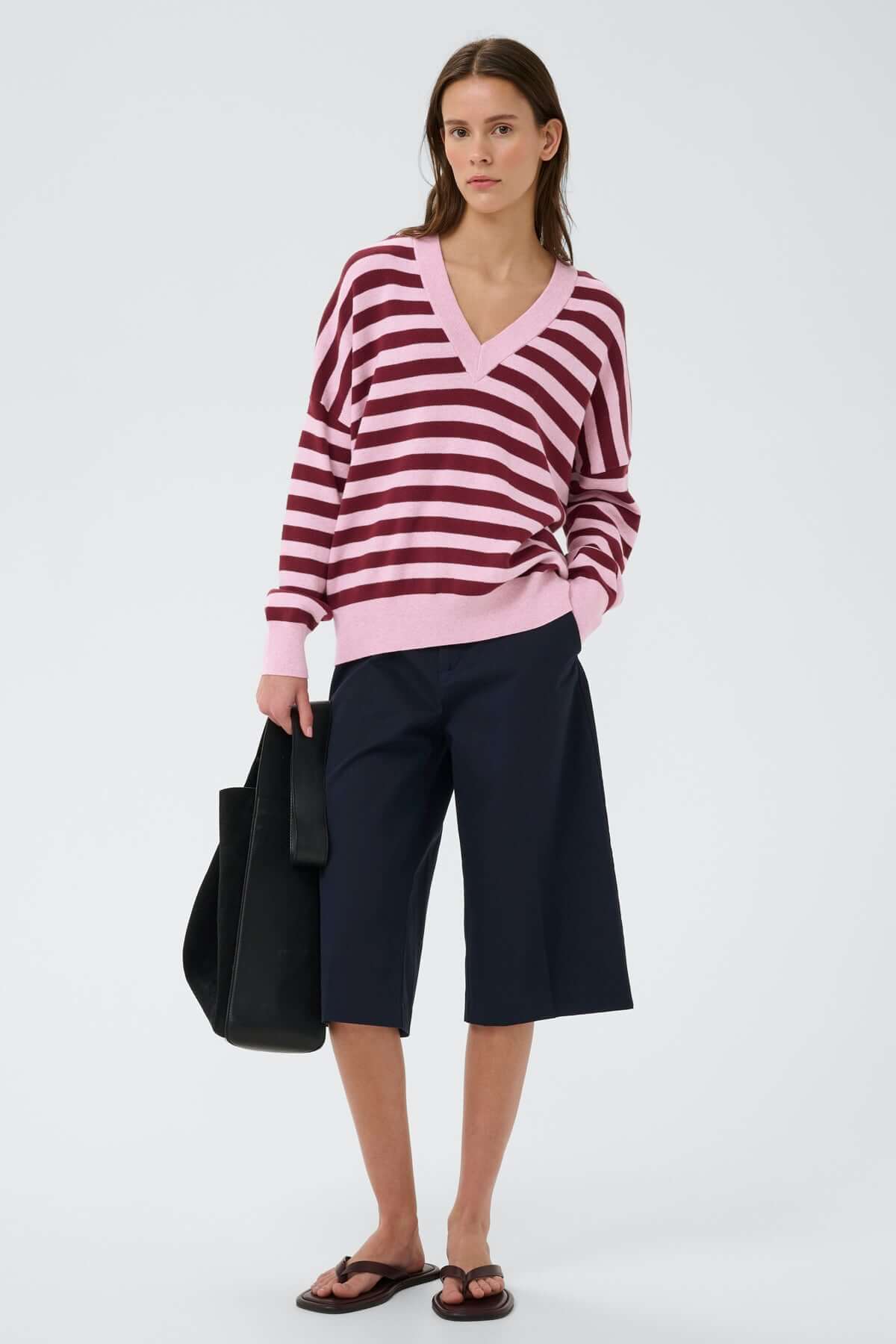 Description : Chandail en coton à col en V, à la coupe décontractée et aux finitions soignées. Sa texture douce et son tombé fluide en font une pièce confortable à porter au quotidien. Idéal pour créer un ensemble coordonné ou à combiner avec un jean pour une allure simple et moderne.