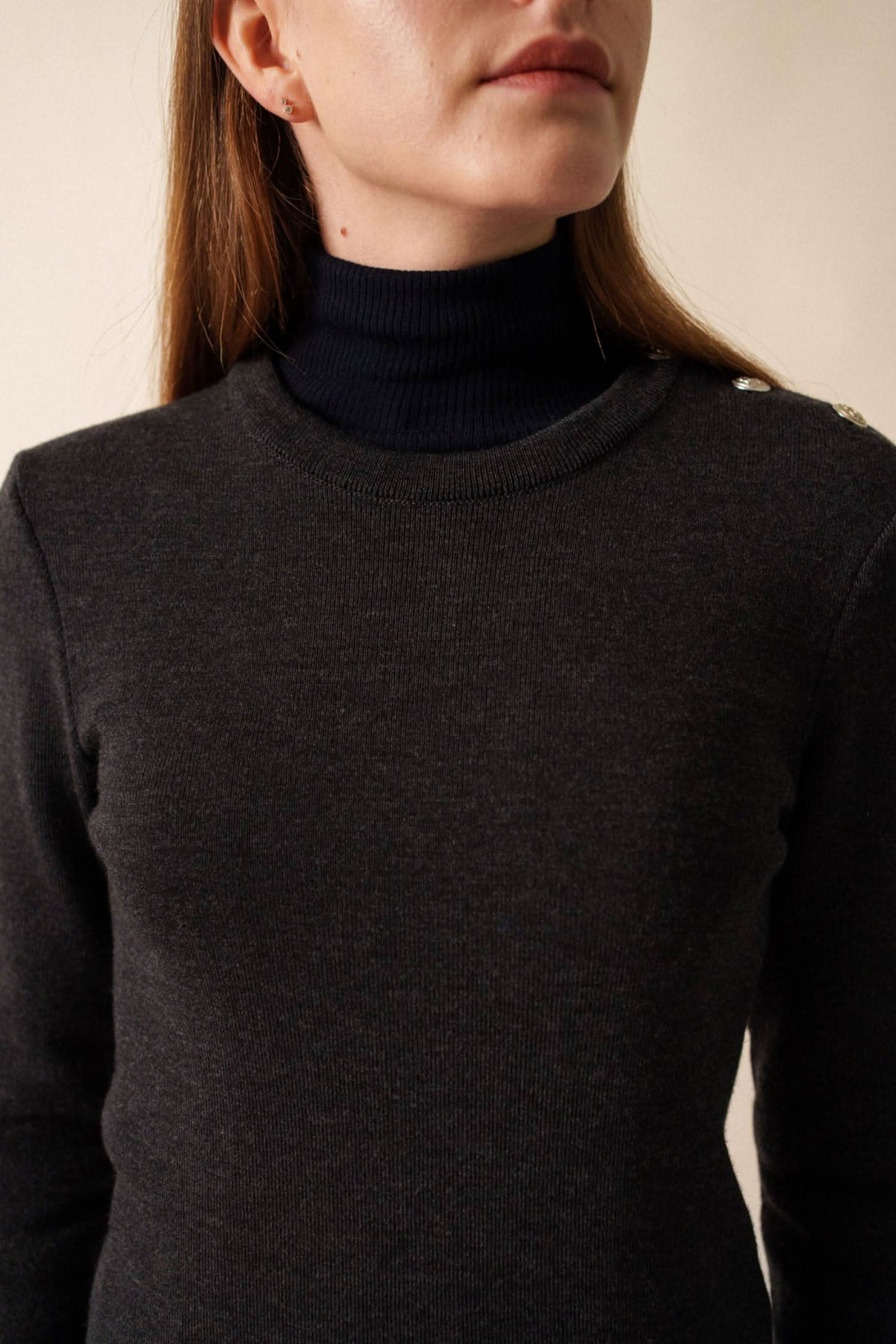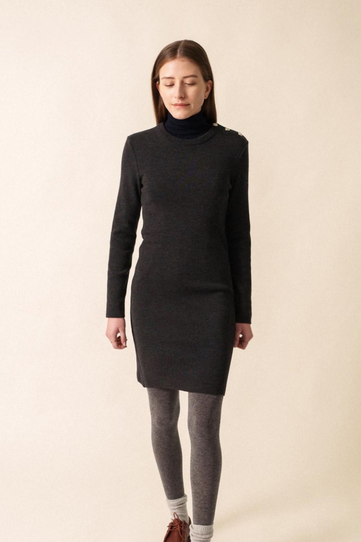 Robe Grande Maree U en laine douce, coupe ajustée, col rond et patte de boutonnage sur l'épaule.