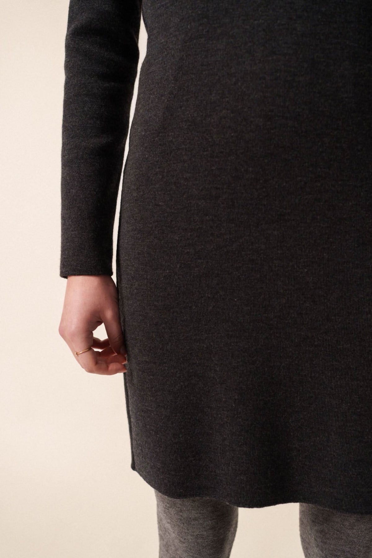 Robe Grande Maree U en maille fine, coupe ajustée, portée avec collants et bottines, pour un look automnal chic.