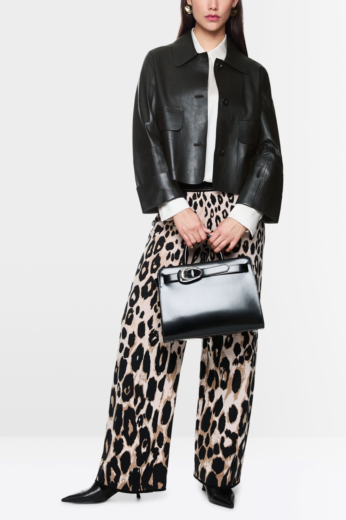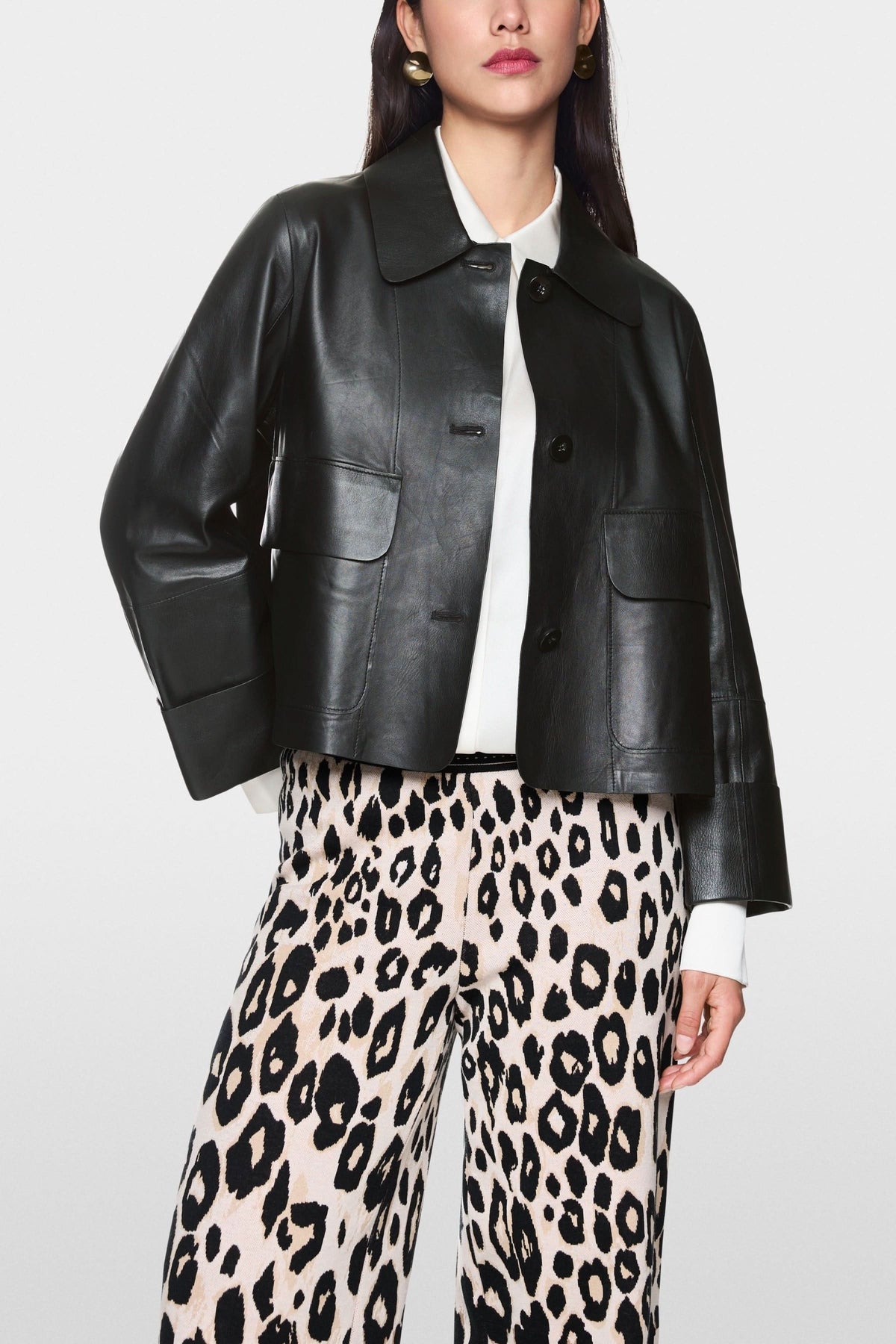 Description: Cette veste en cuir véritable présente une coupe moderne et légèrement ample. Son design épuré avec col classique et grandes poches plaquées lui confère une allure élégante et contemporaine. Conseil style : portez-la sur une chemise blanche et un pantalon imprimé ou uni pour un look chic et affirmé.