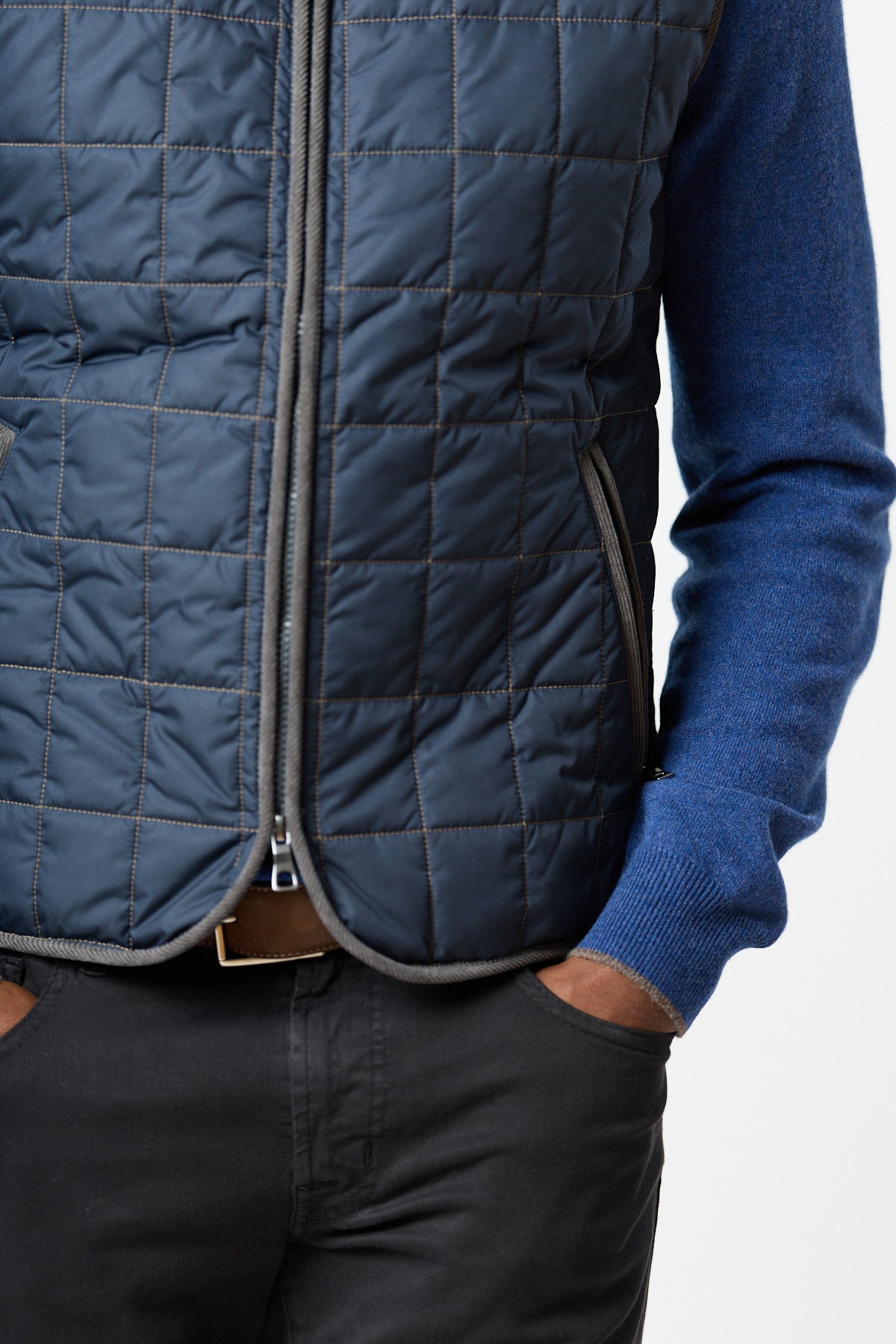 Veste sans manches matelassée avec détails en velours côtelé portée sur un homme élégant, ajoutant style et confort sophistiqué.