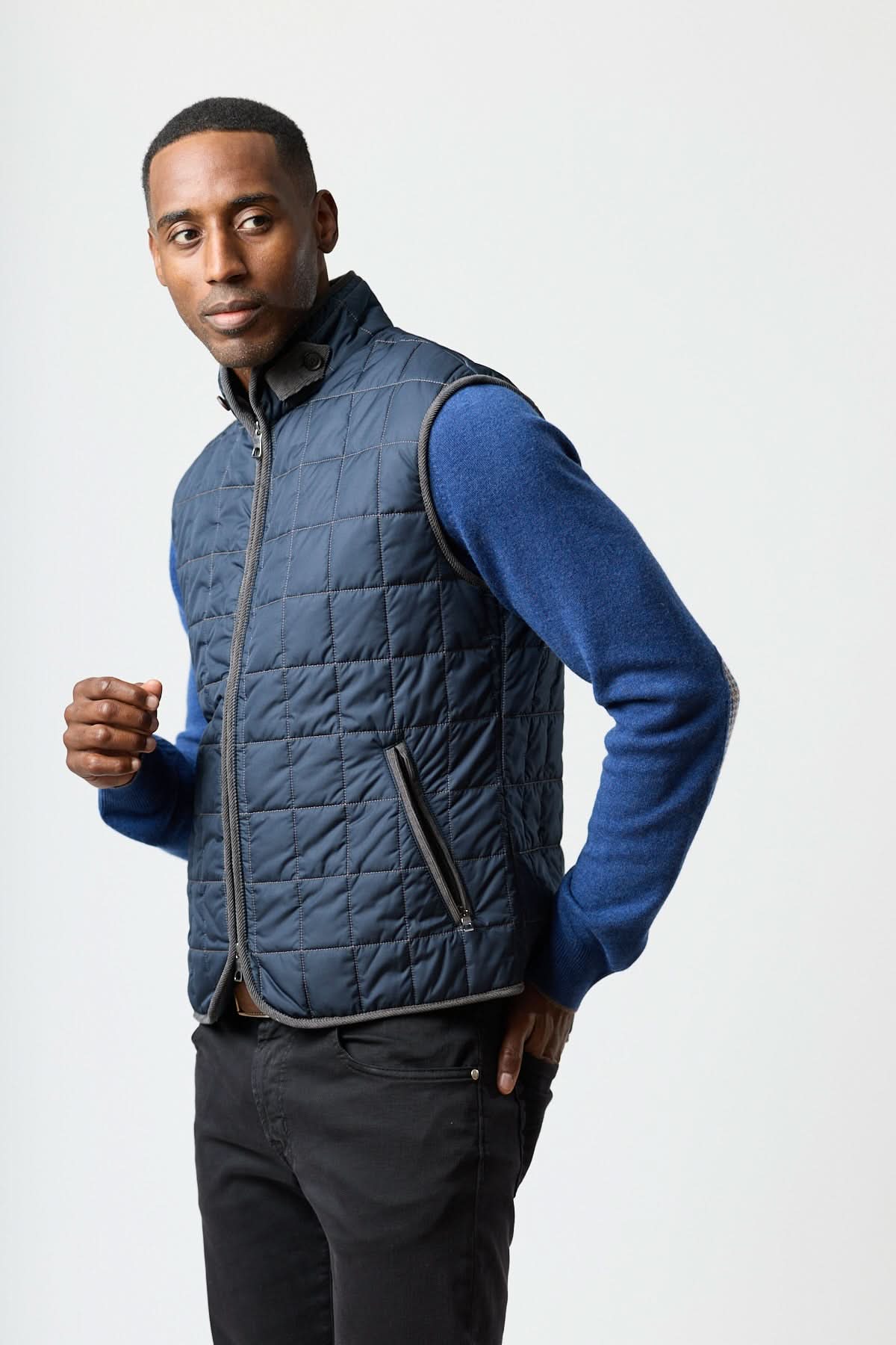 Alt Tag: Homme portant une veste sans manches matelassée avec détails en velours côtelé, idéale pour un style élégant et pratique.