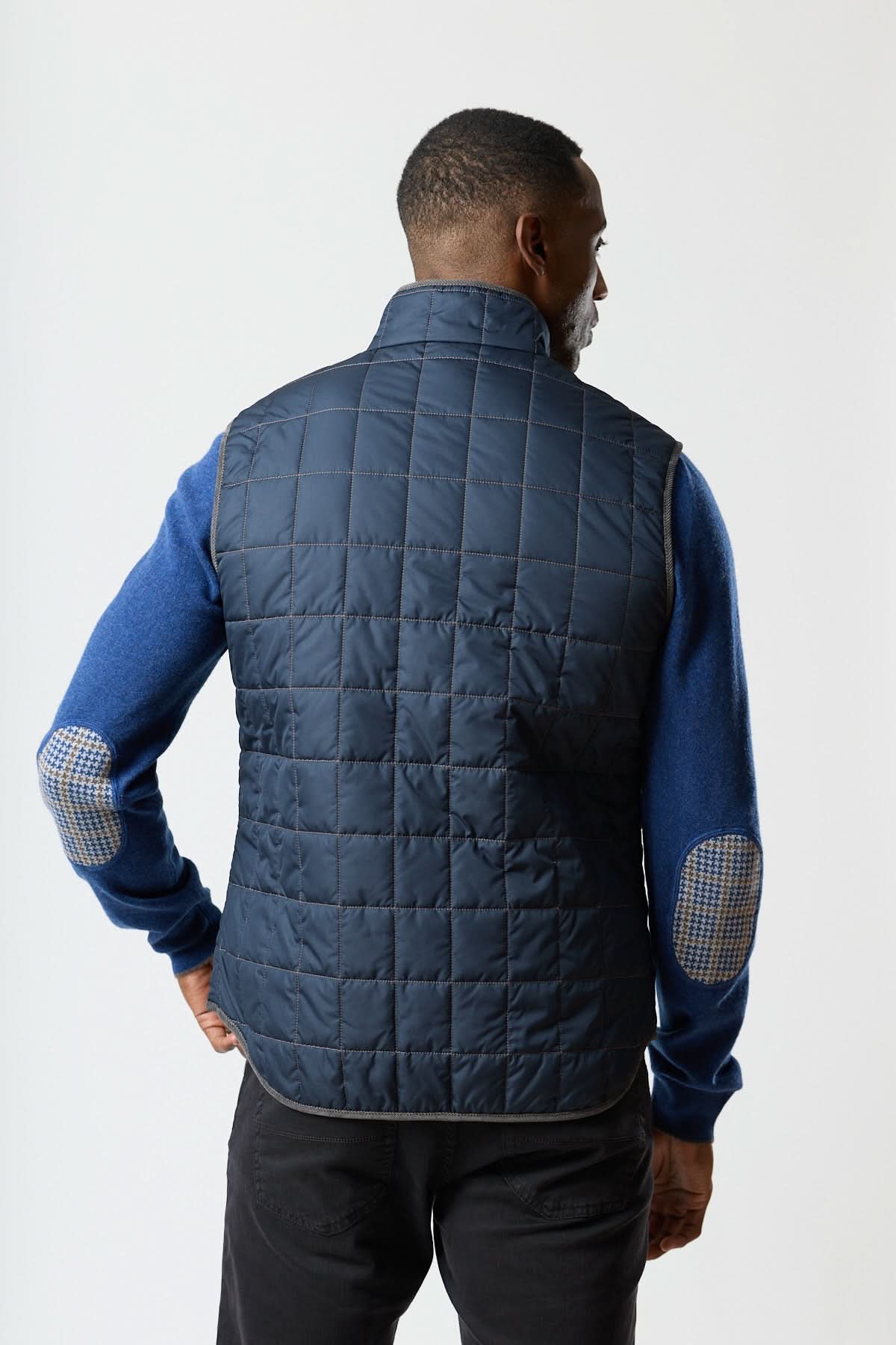 Homme portant Veste sans manches matelassée avec détails en velours côtelé vue de dos.