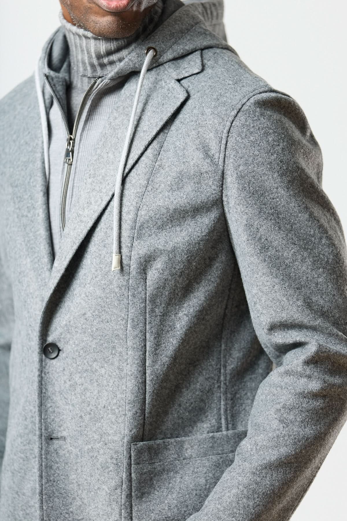Homme portant un veston hybride à capuche en laine foulée grise, avec col roulé gris, style urbain élégant.